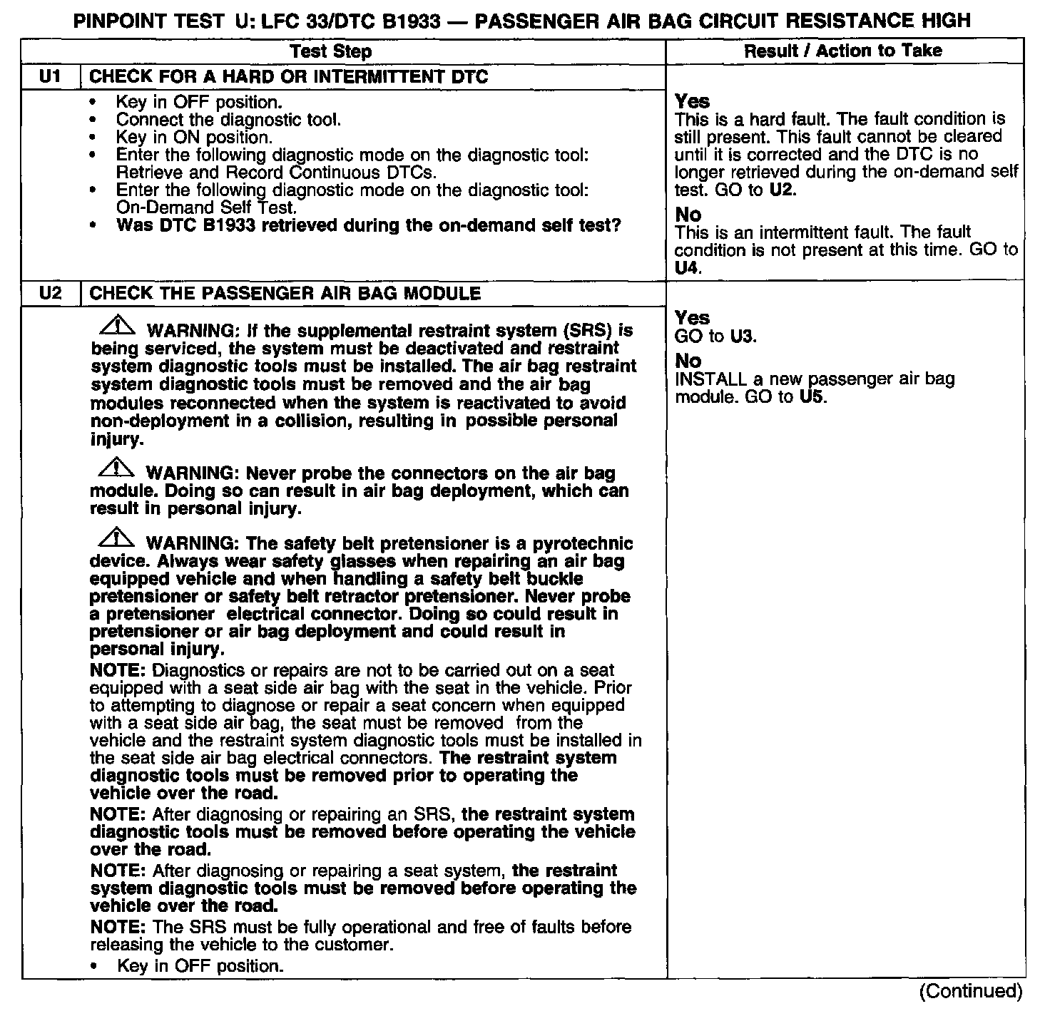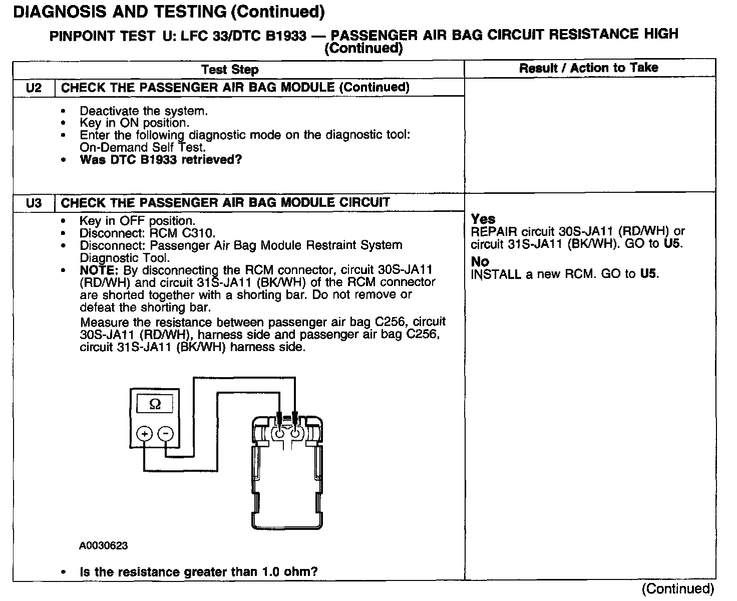 PINPOINT TEST U: LFC 33/DTC B1933 - PASSENGER AIR BAG CIRCUIT RESISTANCE HIGHTest U1-U2: