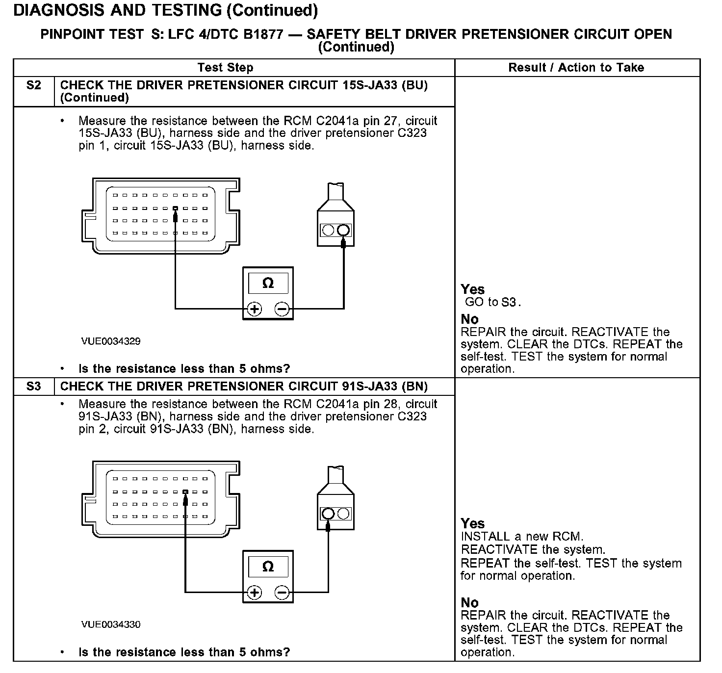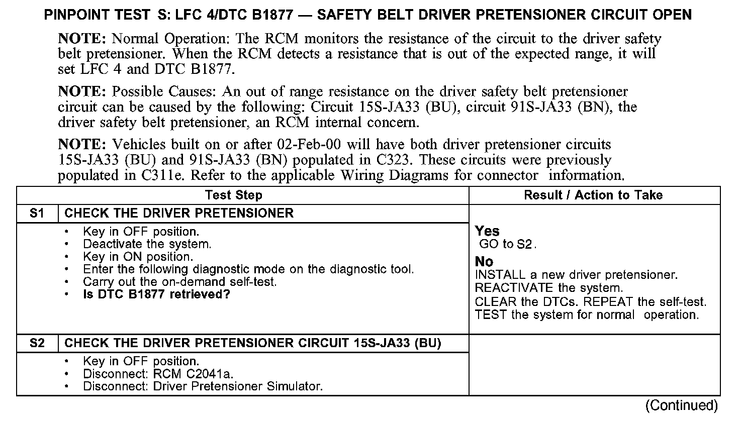 PINPOINT TEST S: LFC 4/DTC B1877 - SAFETY BELT DRIVER PRETENSIONER CIRCUIT OPEN