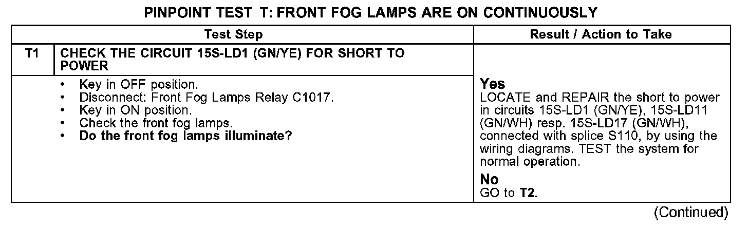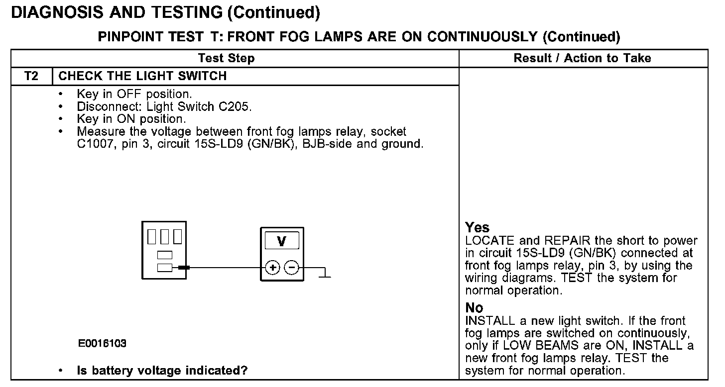PINPOINT TEST T: FRONT FOG LAMPS ARE ON CONTINUOUSLY