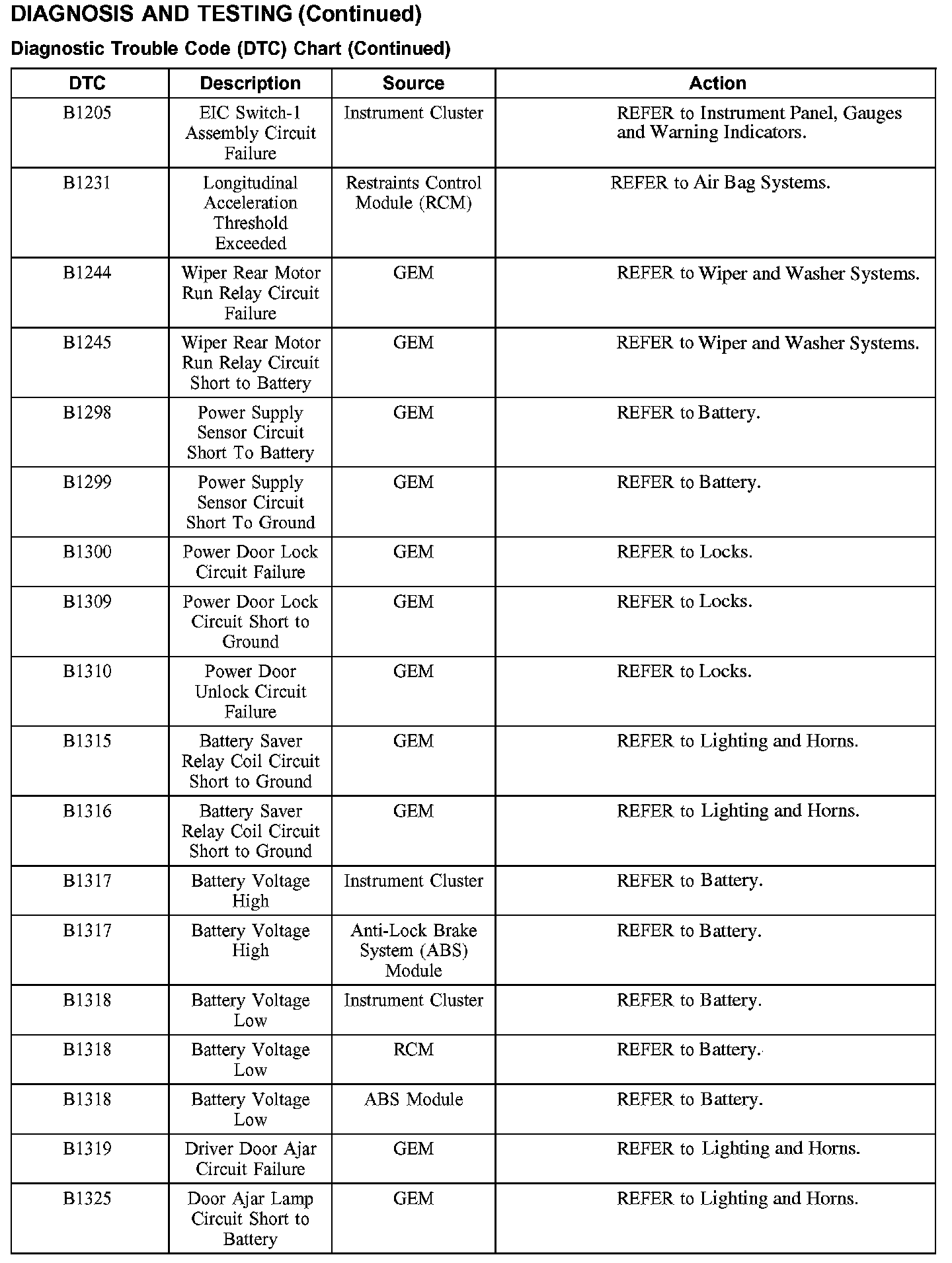DTC Chart B1205 - B1325: