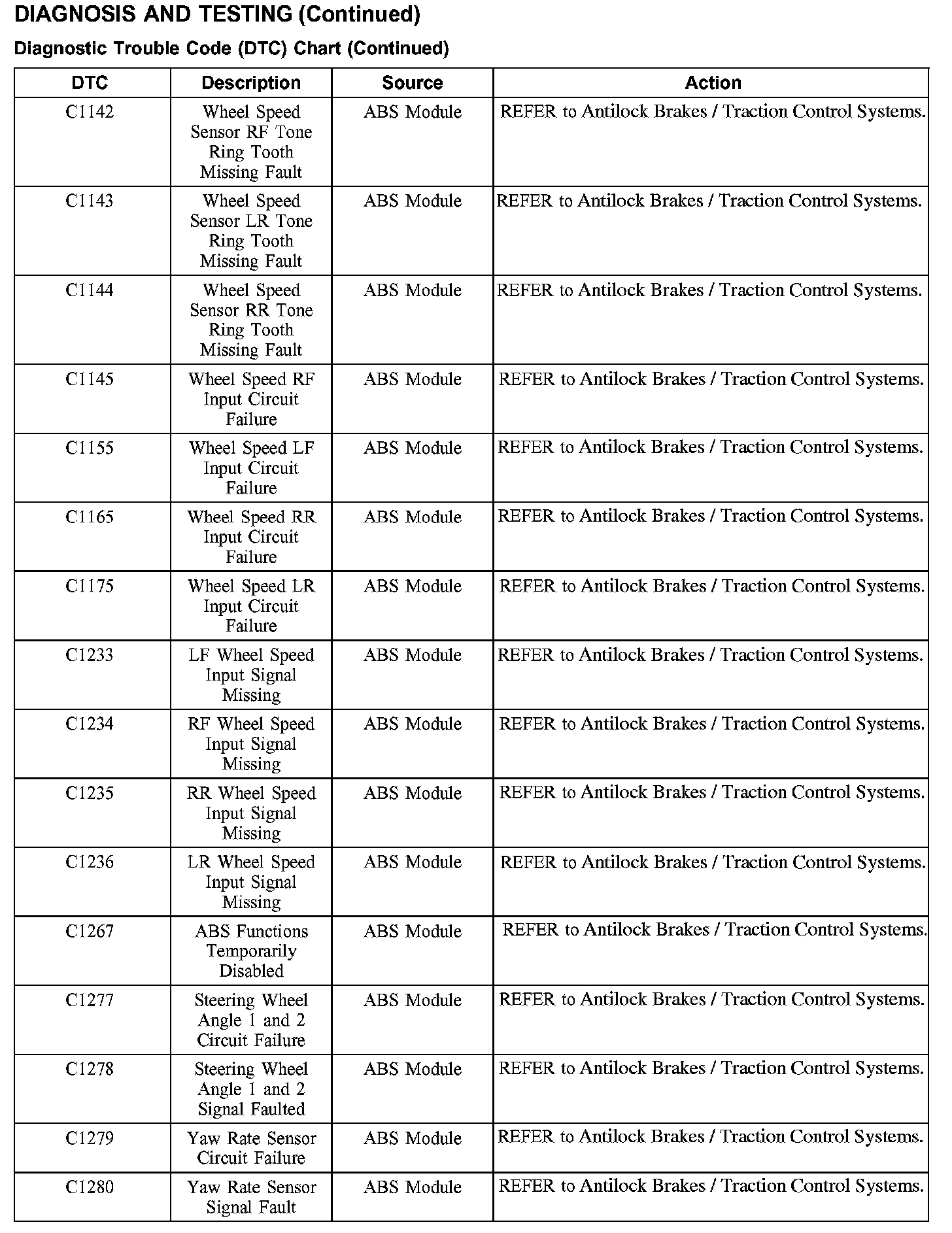 DTC Chart C1142 - C1280: