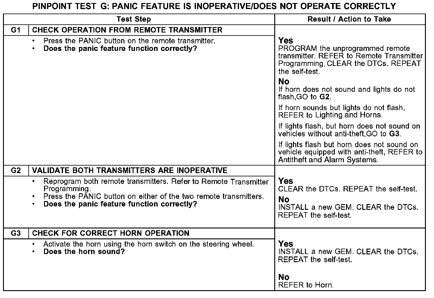 PINPOINT TEST G: PANIC FEATURE IS INOPERATIVE/DOES NOT OPERATE CORRECTLY