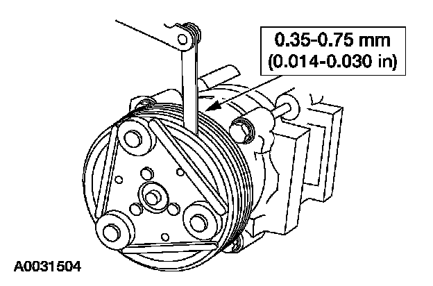 8. Measure and adjust the clutch air gap by removing or adding the A/C clutch disc and hub spacers.