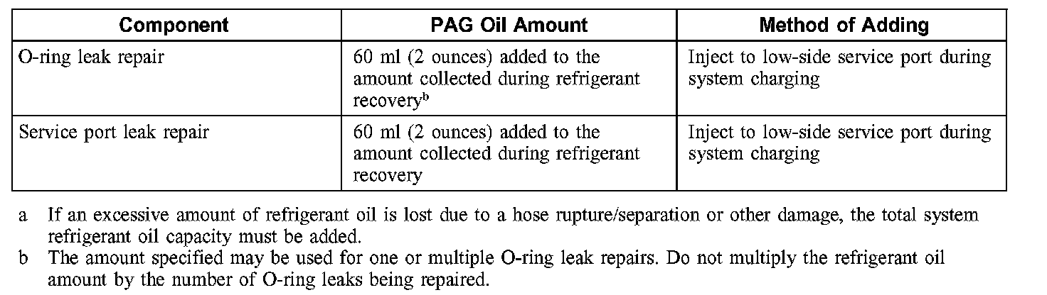 CAUTION: During normal A/C operation, oil is circulated through the system with the refrigerant, and a small amount is retained in each component. If certain components of the system are removed, some of the refrigerant oil will go with the component. To maintain the original total oil charge, it is necessary to compensate for the oil lost by adding oil to the system with the new part.