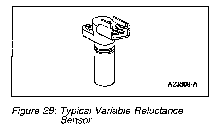 There are two types of CMP sensors: the three pin connector Hall-effect type sensor (Figure 28) found on F-Series 4.2L applications, and the two pin connector variable reluctance sensor found on all other vehicles (Figure 29).