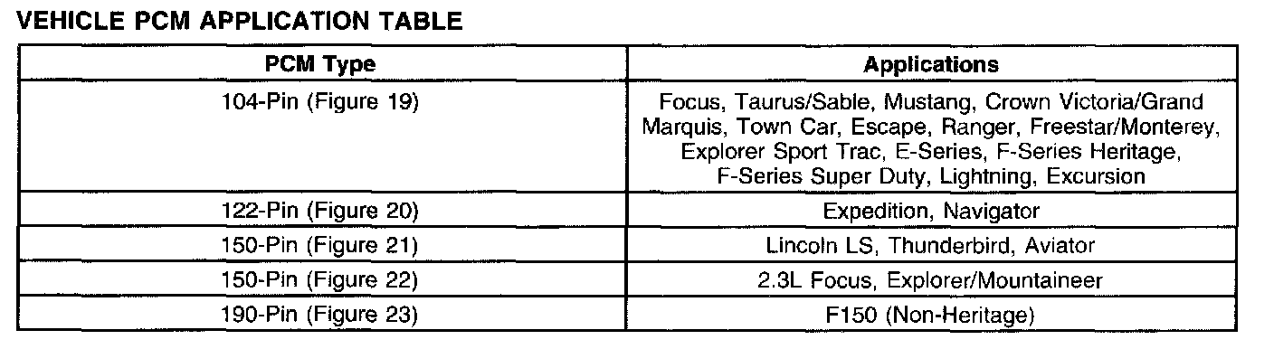 Vehicle PCM Application Table: