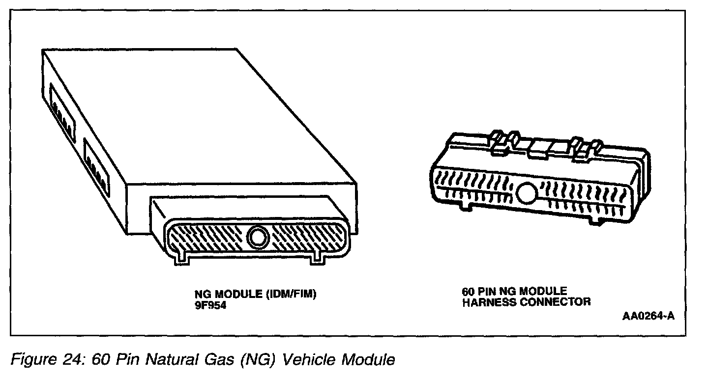 The natural gas (NG) vehicle module (Figure 24) provides two functions. The first function operates the fuel injectors and is referred to as the injector driver module (IDM). The second function sends a fuel level indicator signal to drive the fuel gauge and is called the fuel indicator module (FIM). IDM NG vehicle fuel indicator driver signals are based on powertrain control module (PCM) fuel injector driver signals and are controlled directly by the corresponding injector drivers in the PCM. The IDM must be used to provide the NG fuel injectors with the required high current necessary for proper operation. The greater demand of NG fuel injector current warrants an increased size of the injector driver and increased heat dissipation. Given these conditions, the PCM would not be suitable for placement of these drivers. The IDM closely resembles the Electronic Engine Control 60 Pin PCM module in appearance. This style of module is used on the NG F-Series and Crown Victoria, while a 90 pin Alternative Fuel Control Module (AFCM) (Figure 25) is used on the E-Series.