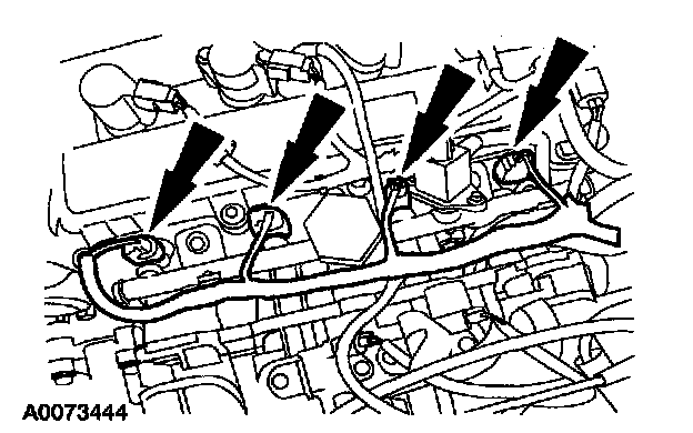 5. Disconnect the fuel injector harness retaining clips from the fuel injection supply manifold.