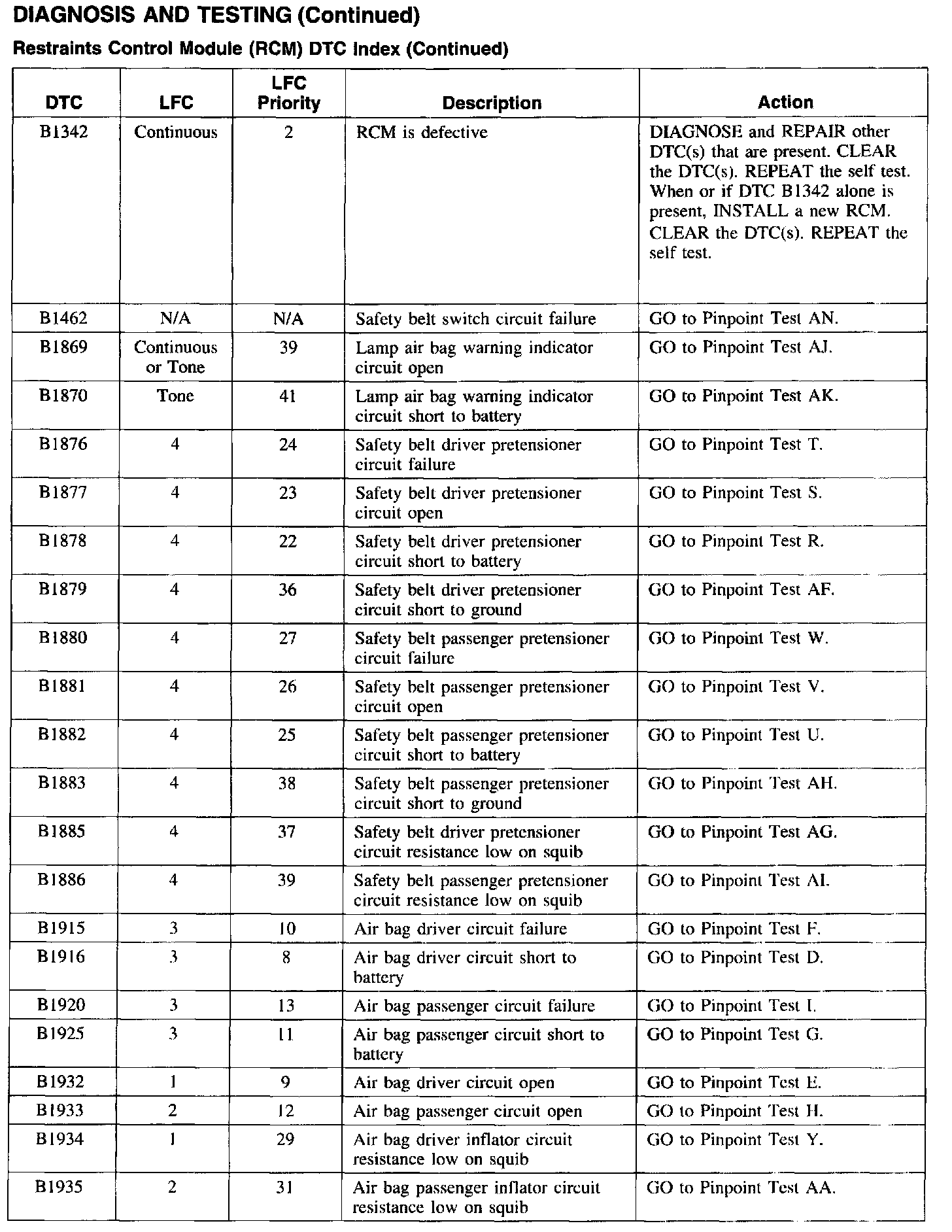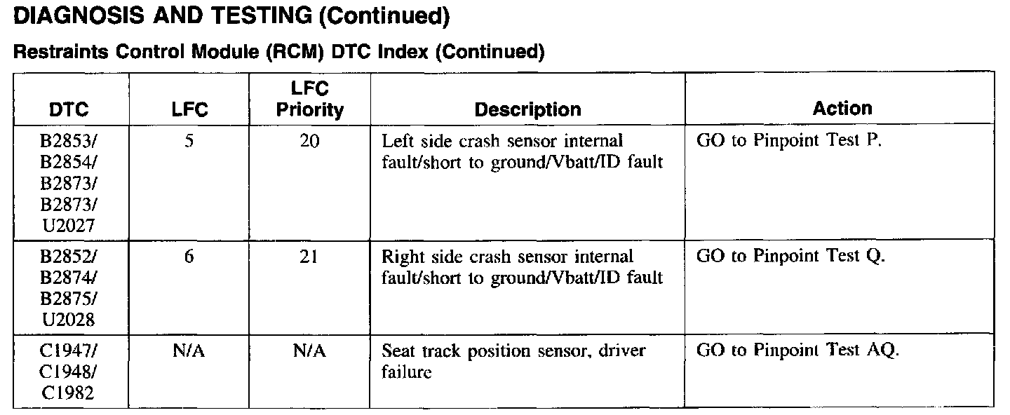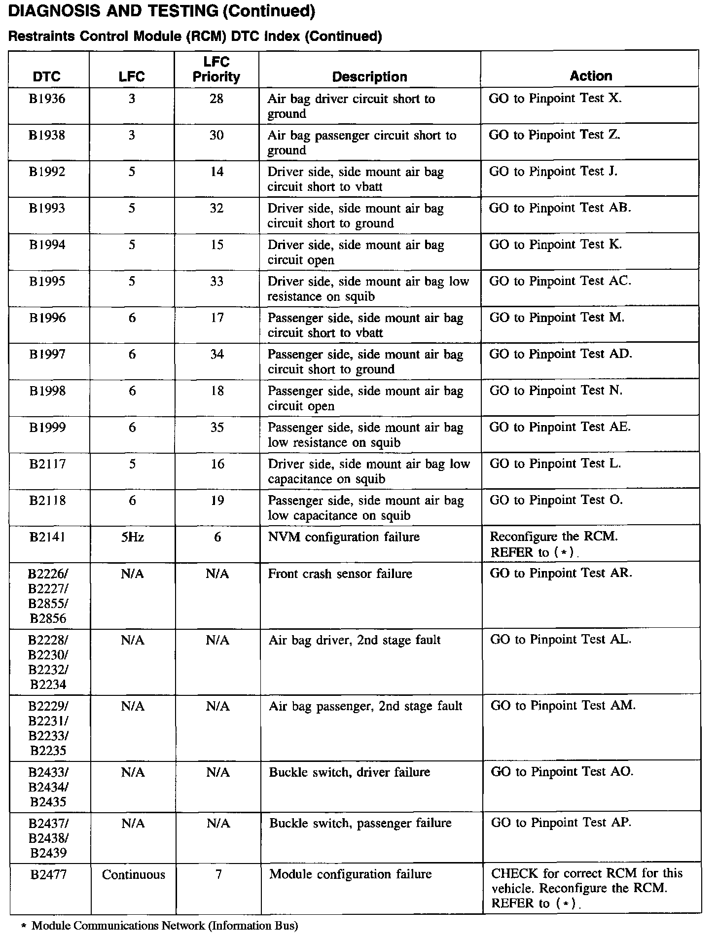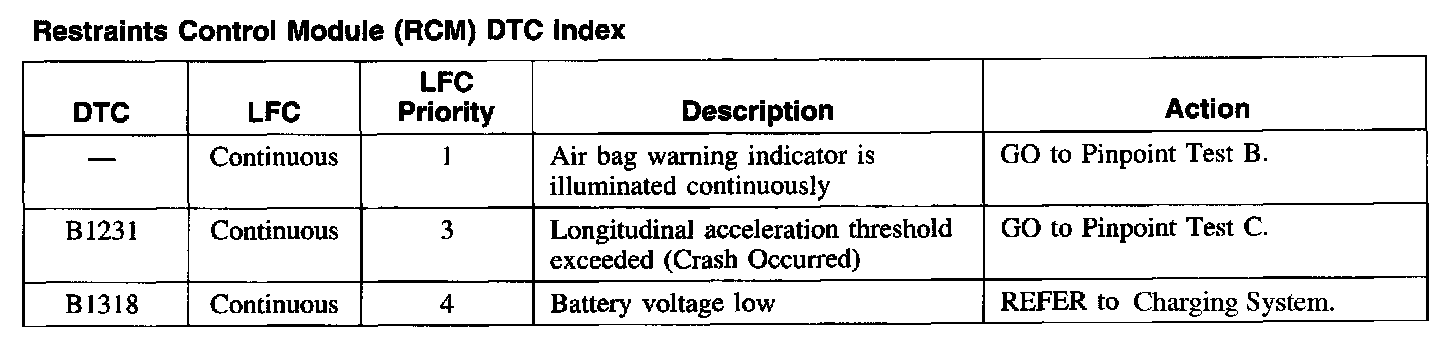 RESTRAINT CONTROL MODULE (RCM) DTC INDEX