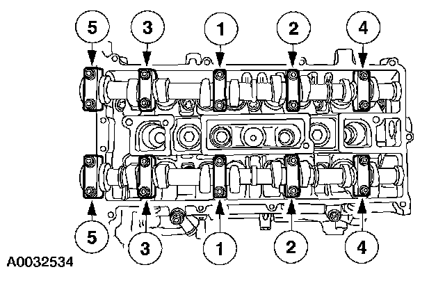 Stage 1: Tighten the camshaft bearing caps one turn at a time until tight.