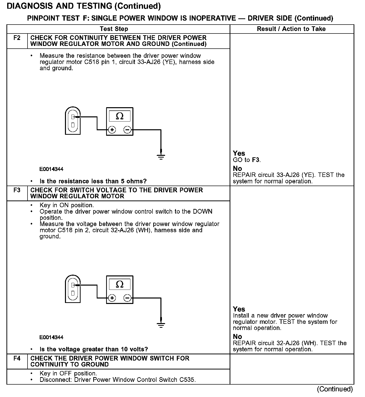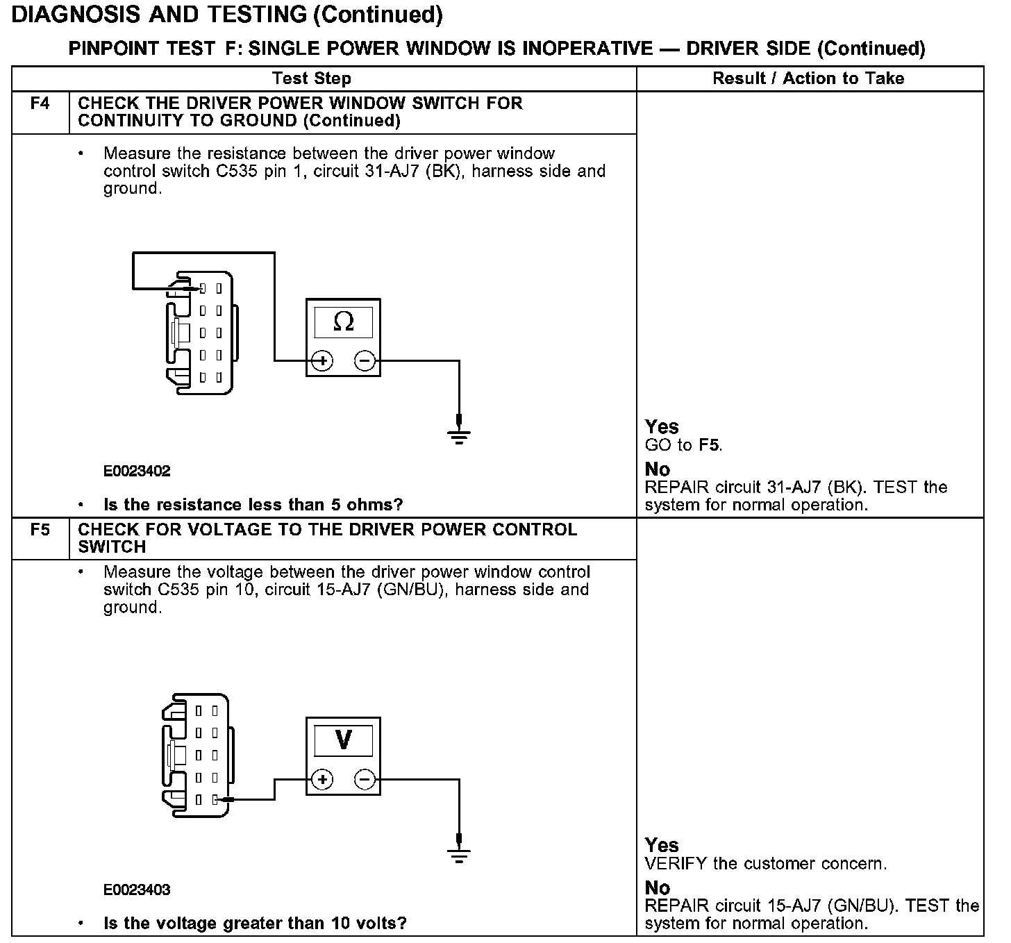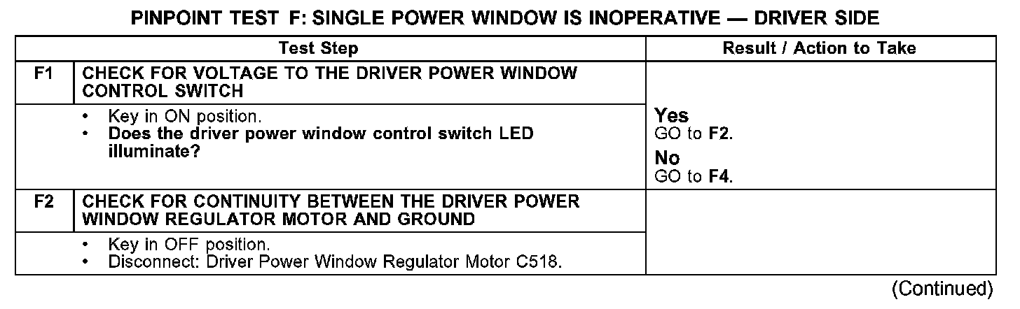 PINPOINT TEST F: SINGLE POWER WINDOW IS INOPERATIVE - DRIVER SIDE