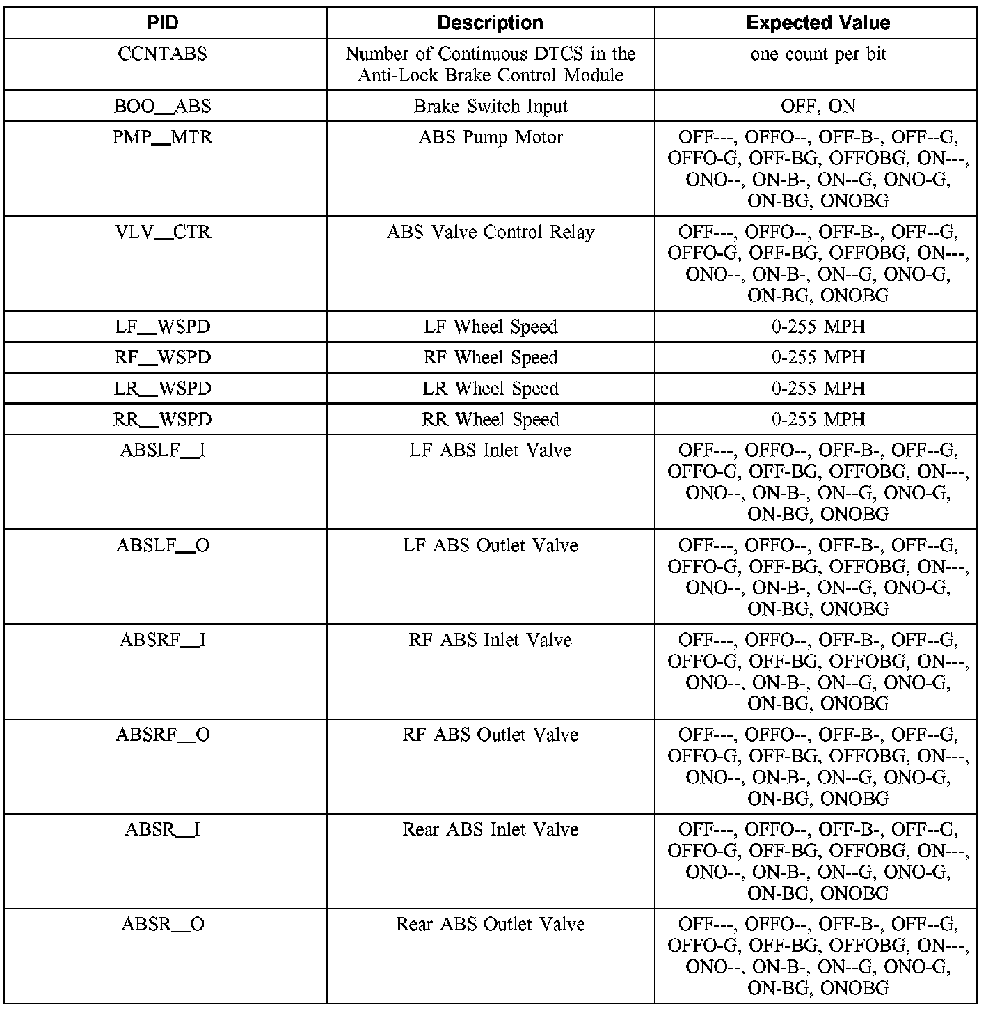 ABS Control Module Parameter Identification (PID) Index
