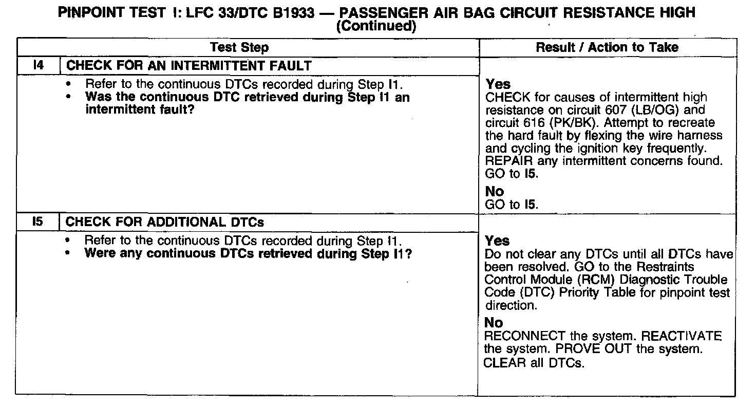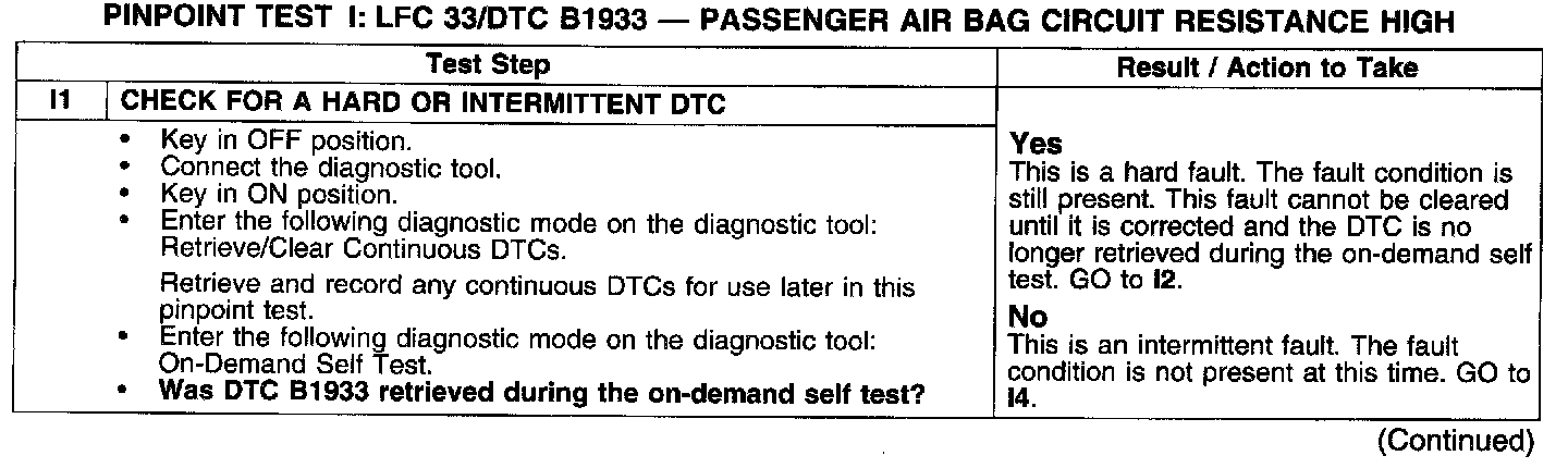 PINPOINT TEST I: LFC 33/DTC B1933 - PASSENGER AIR BAG CIRCUIT RESISTANCE HIGHI1: