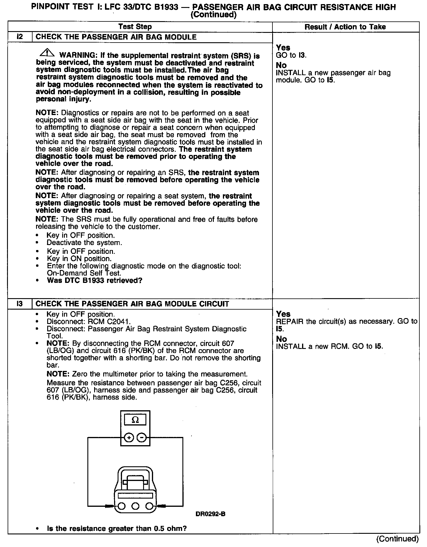 The restraints control module (RCM) monitors the resistance of the passenger air bag ignitor by measuring the resistance between pins 6 and 7. If the RCM detects high resistance between these pins, it will store a diagnostic trouble code (DTC) B1933 in memory and flash a lamp fault code (LFC) 33 (or higher priority code if one exists) on the air bag indicator.