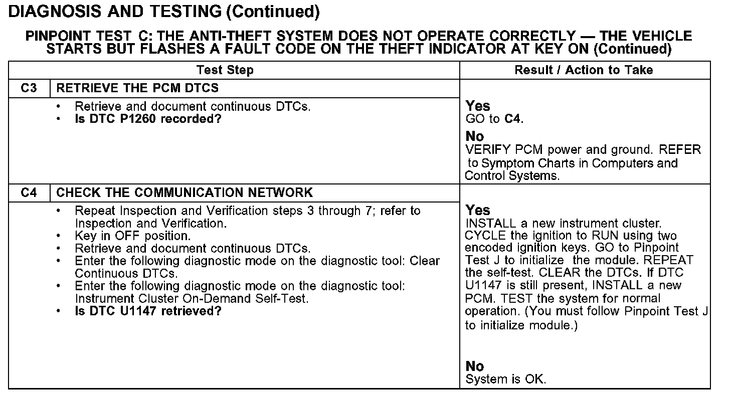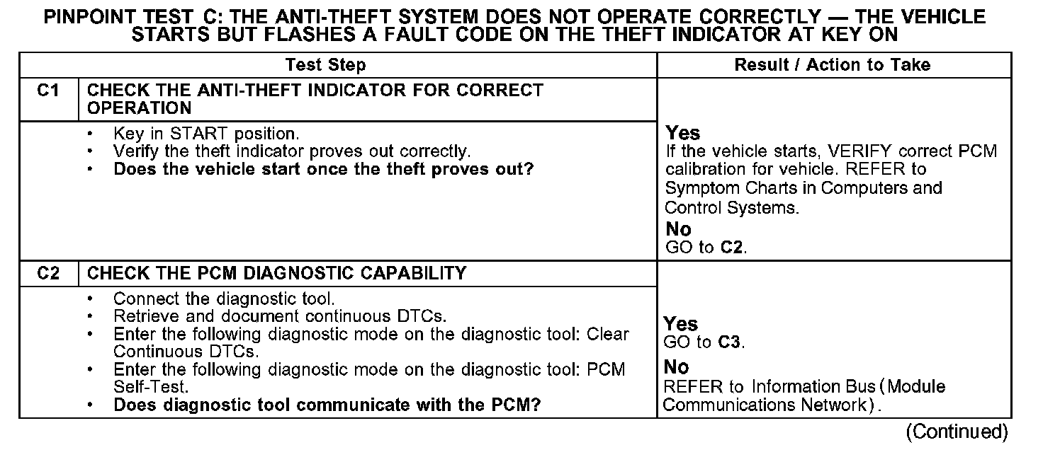 PINPOINT TEST C: THE ANTI-THEFT SYSTEM DOES NOT OPERATE CORRECTLY - THE VEHICLE STARTS BUT FLASHES A FAULT CODE ON THE THEFT INDICATOR AT KEY ON