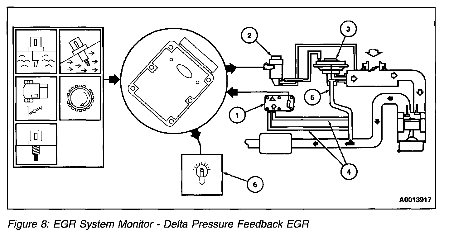 5. The EGR flow rate test is performed during a steady state when engine speed and load are moderate and EVR duty cycle is high. The monitor compares the actual DPFE circuit voltage to a desired EGR flow voltage for that state to determine if EGR flow rate is acceptable or insufficient. This is a system test and may trigger a DTC for any fault causing the EGR system to fail.