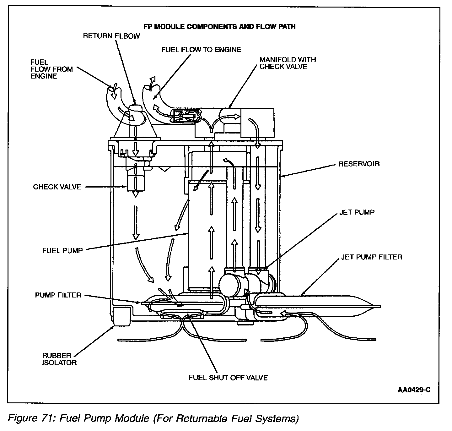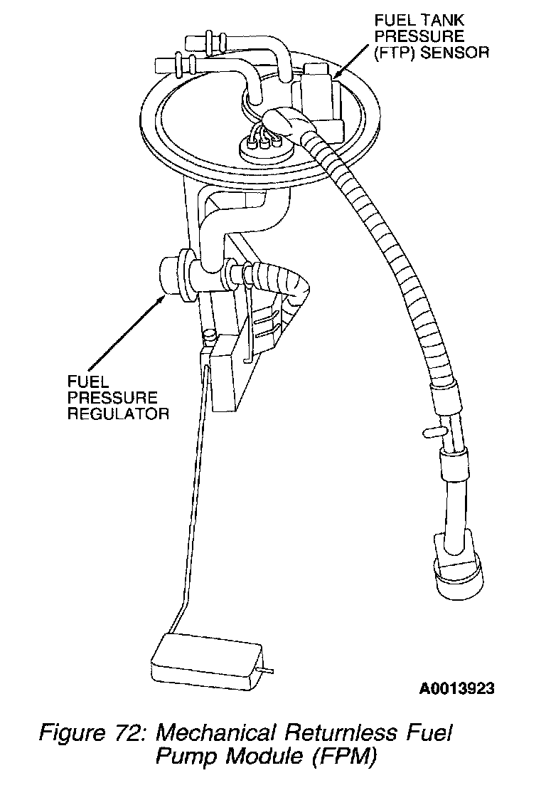 The fuel pump (FP) module (Figure 71),(Figure 72) and(Figure 73) is a device that contains the fuel pump and sender assembly. The fuel pump is located inside the FP module reservoir and supplies fuel through the FP module manifold to the engine and FP module jet pump. The jet pump continuously refills the reservoir with fuel, and a check valve located in the manifold outlet maintains system pressure when the fuel pump is not energized. A flapper valve located in the bottom of the reservoir allows fuel to enter the reservoir and prime the fuel pump during the initial fill.