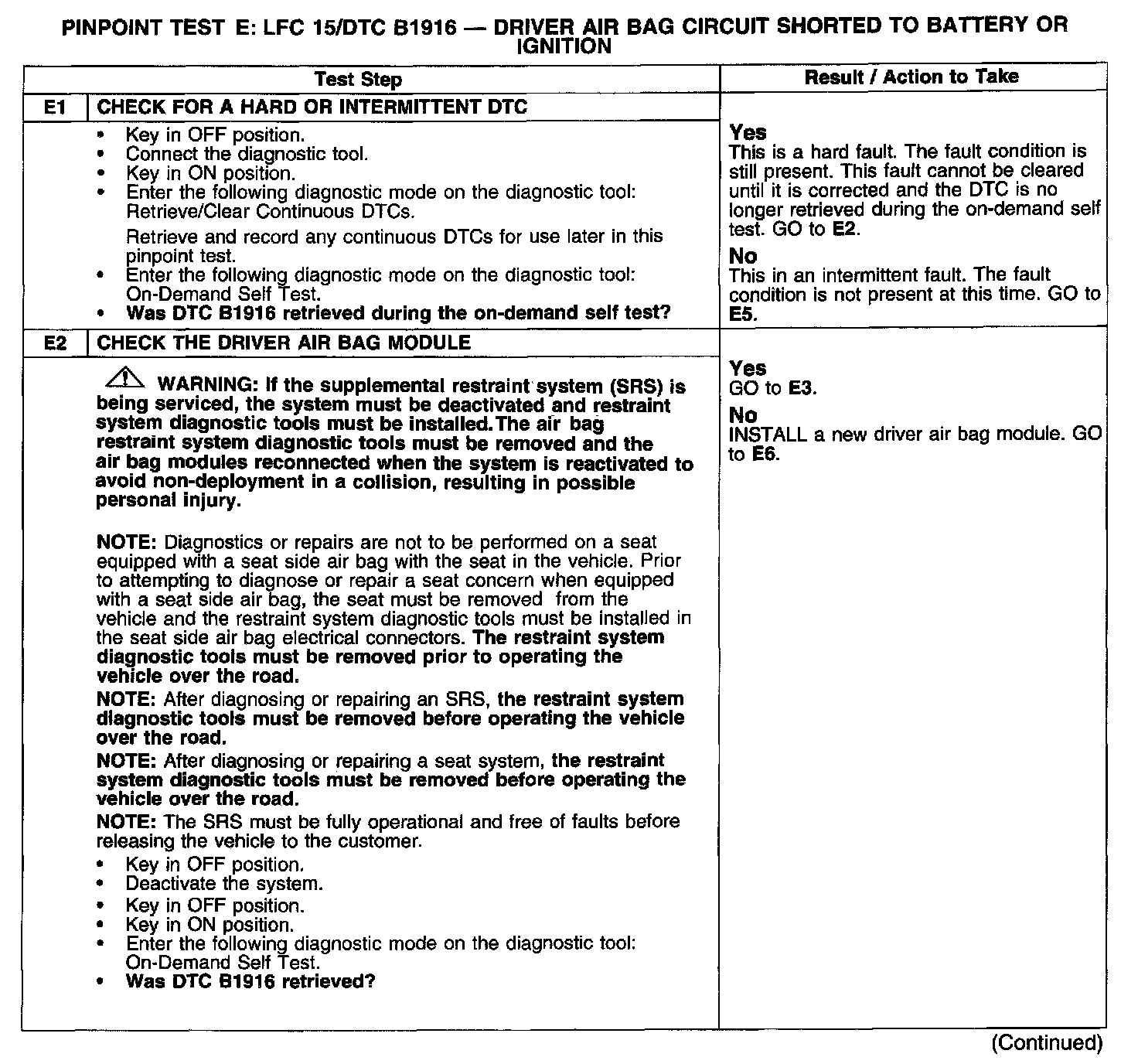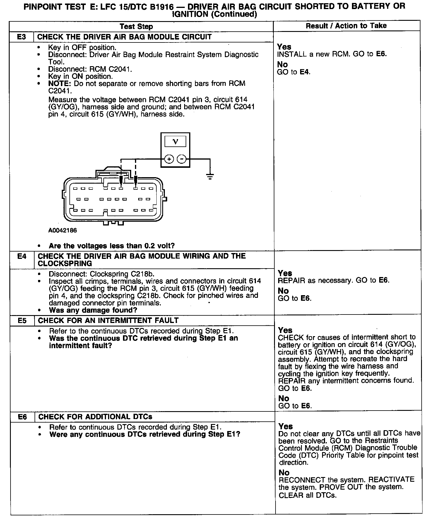 PINPOINT TEST E: LFC 15/DTC B1916 - DRIVER AIR BAG CIRCUIT SHORTED TO BATTERY OR IGNITIONE1 - E2: