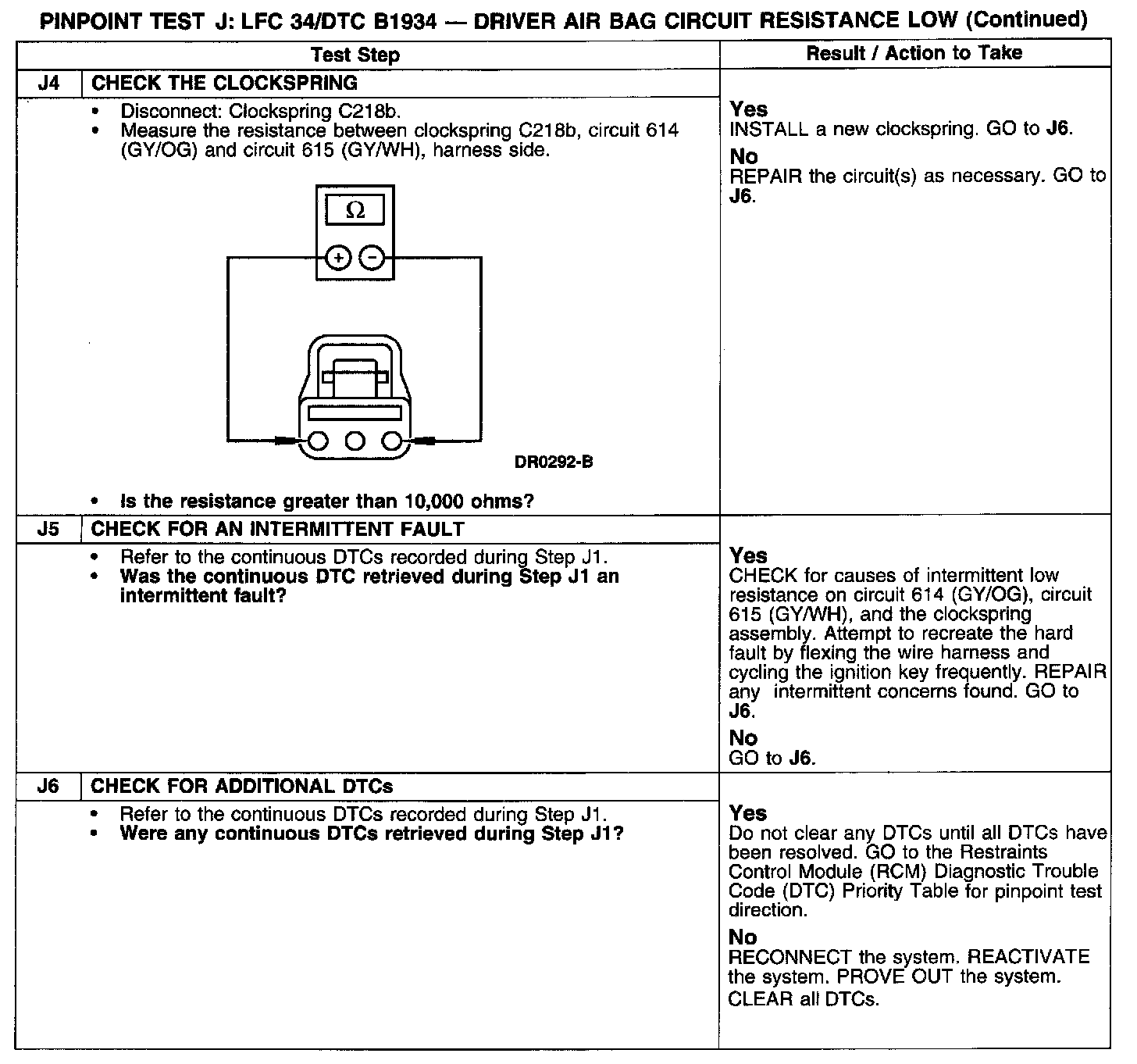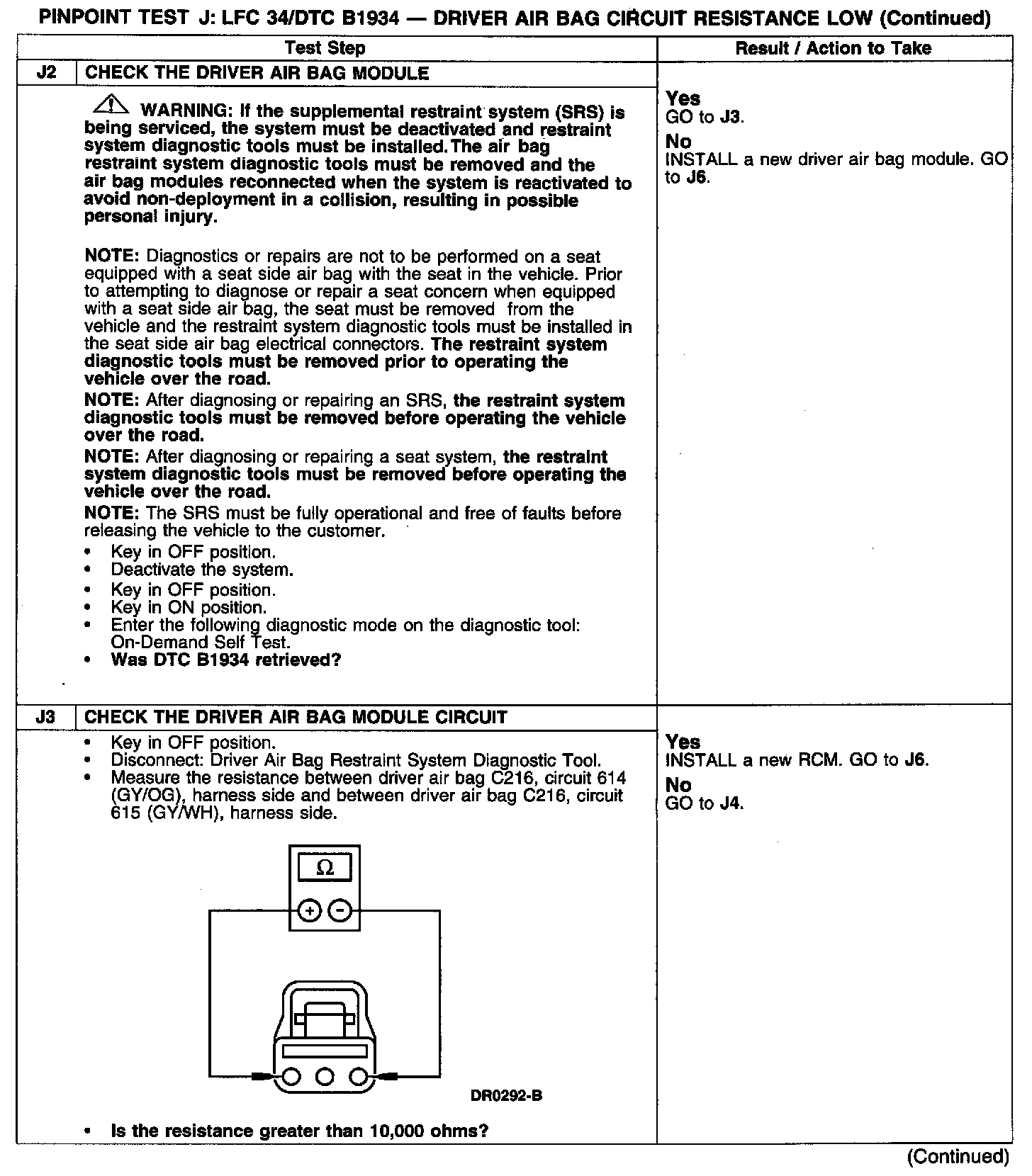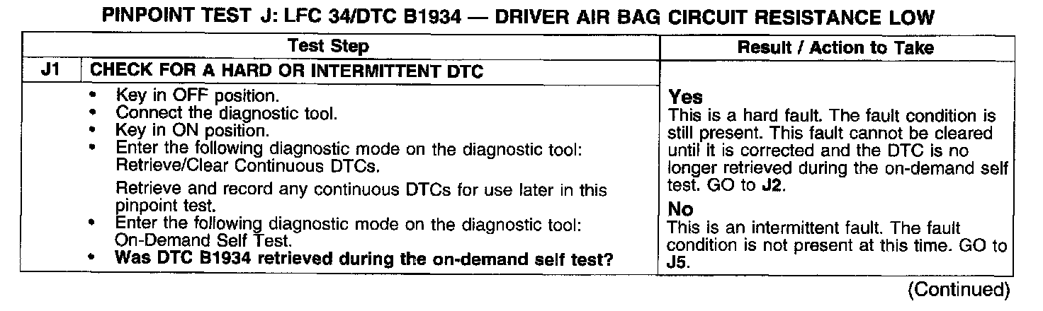 PINPOINT TEST J: LFC 34/DTC B1934 - DRIVER AIR BAG CIRCUIT RESISTANCE LOWJ1: