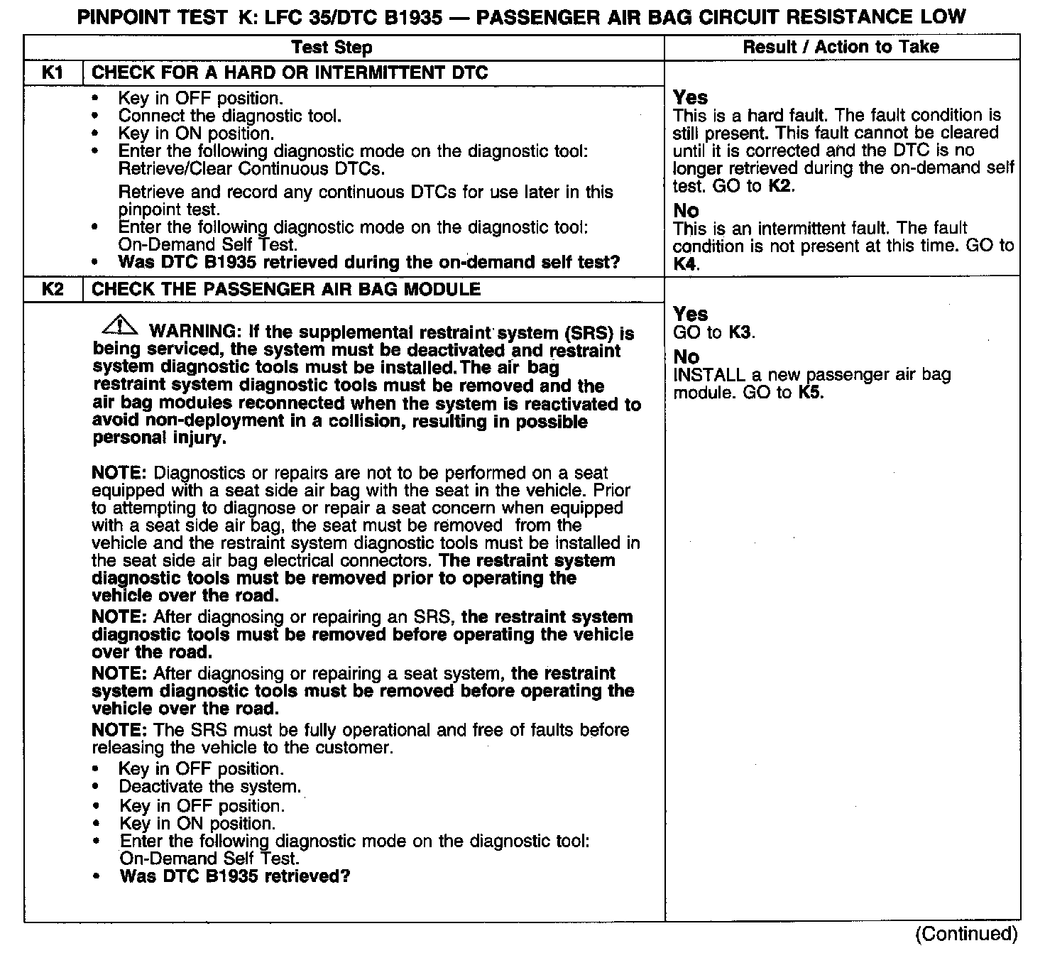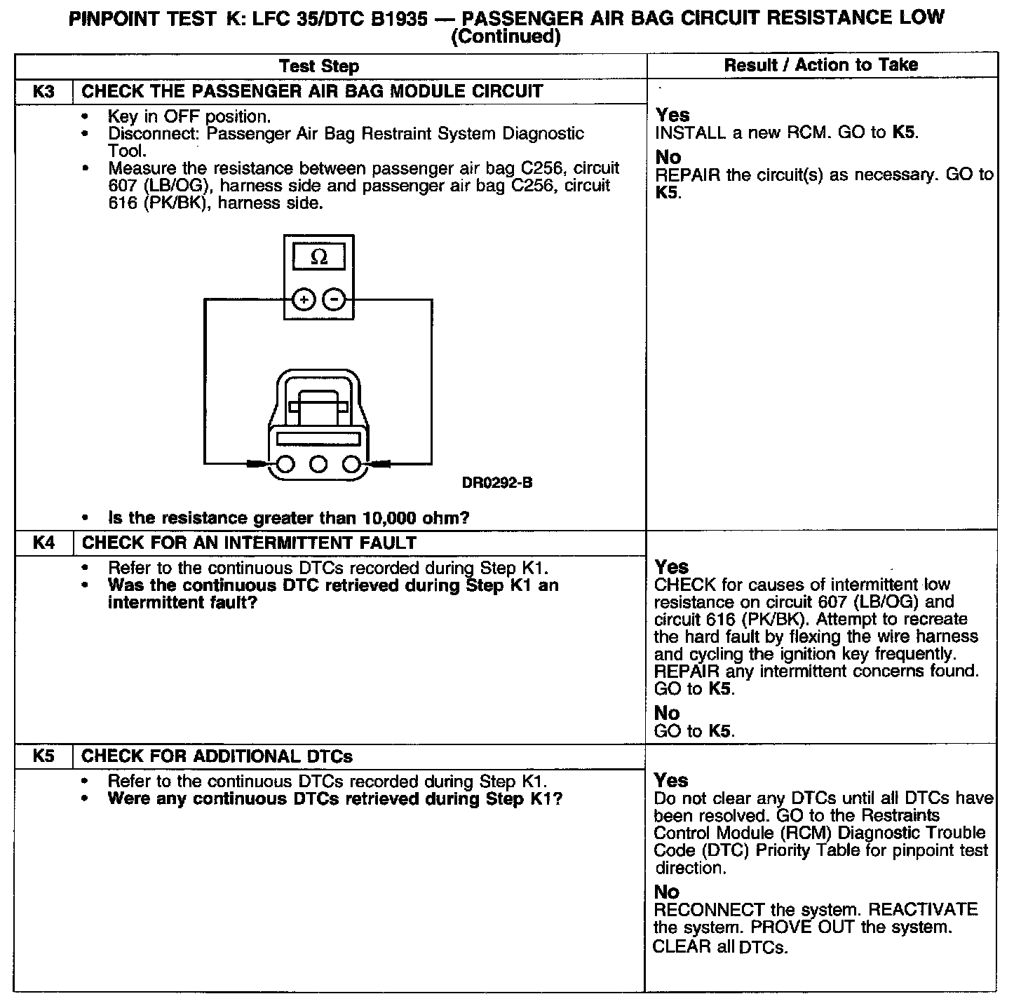 PINPOINT TEST K: LFC 35/DTC B1935 - PASSENGER AIR BAG CIRCUIT RESISTANCE LOWK1 - K2: