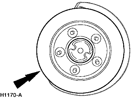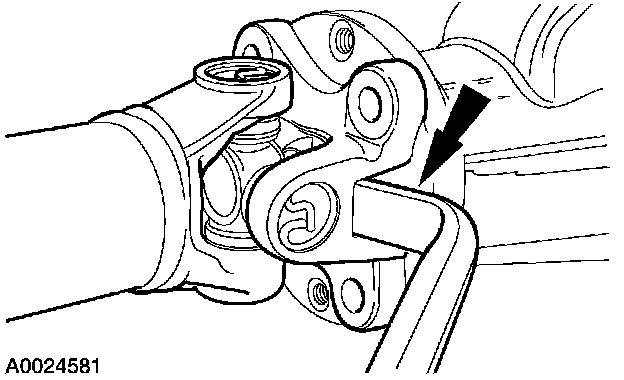 CAUTION: The driveshaft centering socket yoke fits tightly on the rear axle pinion flange pilot. Never hammer on the driveshaft or any of its components to disconnect the yoke from the flange. Pry only in the area shown, with a suitable tool, to disconnect the yoke from the flange.