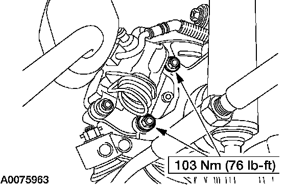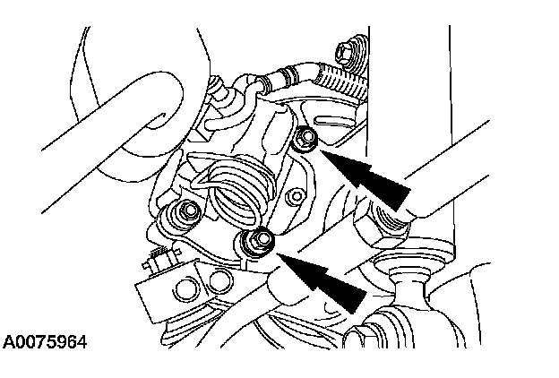 13. Remove the rear brake caliper and support bracket from the knuckle as an assembly. Wire the caliper and support bracket assembly out of the way.