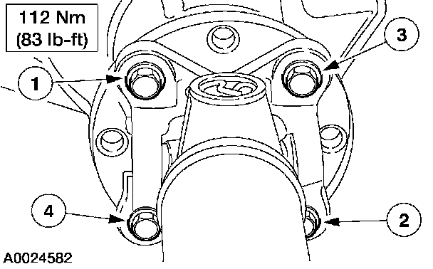 CAUTION: The driveshaft centering socket yoke fits tightly on the rear axle pinion flange pilot. To make sure that the yoke seats squarely on the flange, tighten the bolts evenly in a cross pattern as shown.