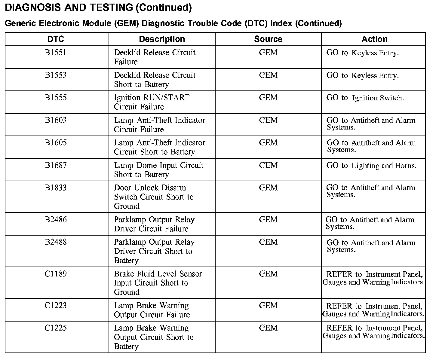 DTC Index B1551 - C1225:
