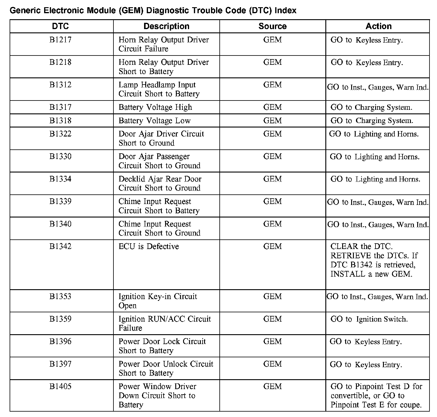 GEM Diagnostic Trouble Code (DTC) Index