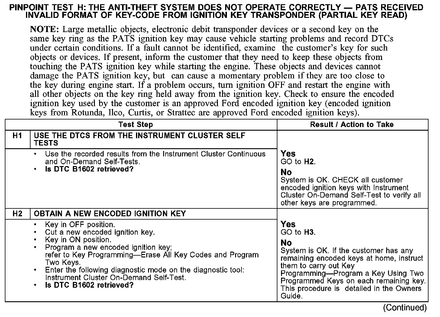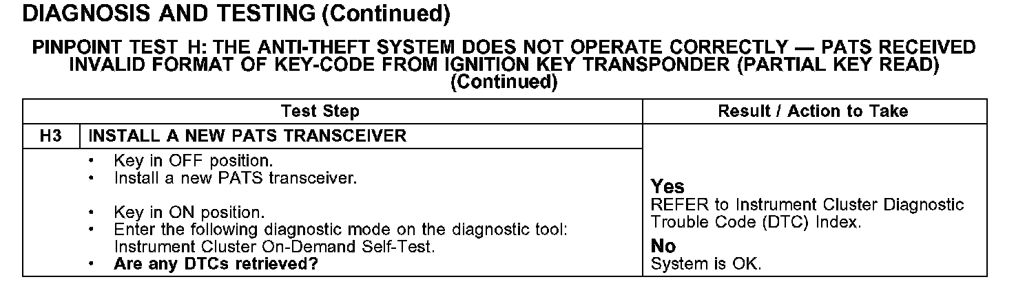 PINPOINT TEST H: THE ANTI-THEFT SYSTEM DOES NOT OPERATE CORRECTLY - PATS RECEIVED INVALID FORMAT OF KEY-CODE FROM IGNITION KEY TRANSPONDER (PARTIAL KEY READ)