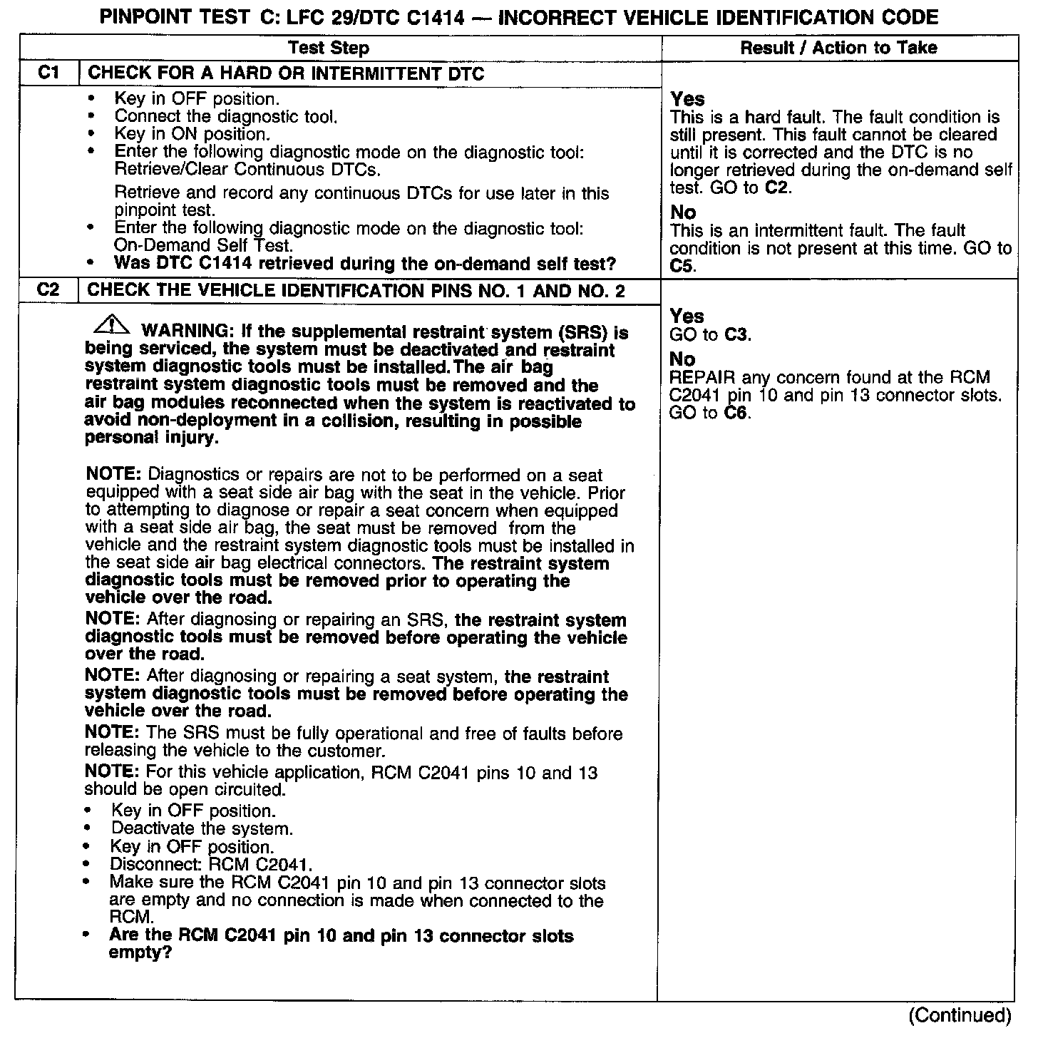 PINPOINT TEST C: LFC 29/DTC C1414 - INCORRECT VEHICLE IDENTIFICATION CODEC1 - C2: