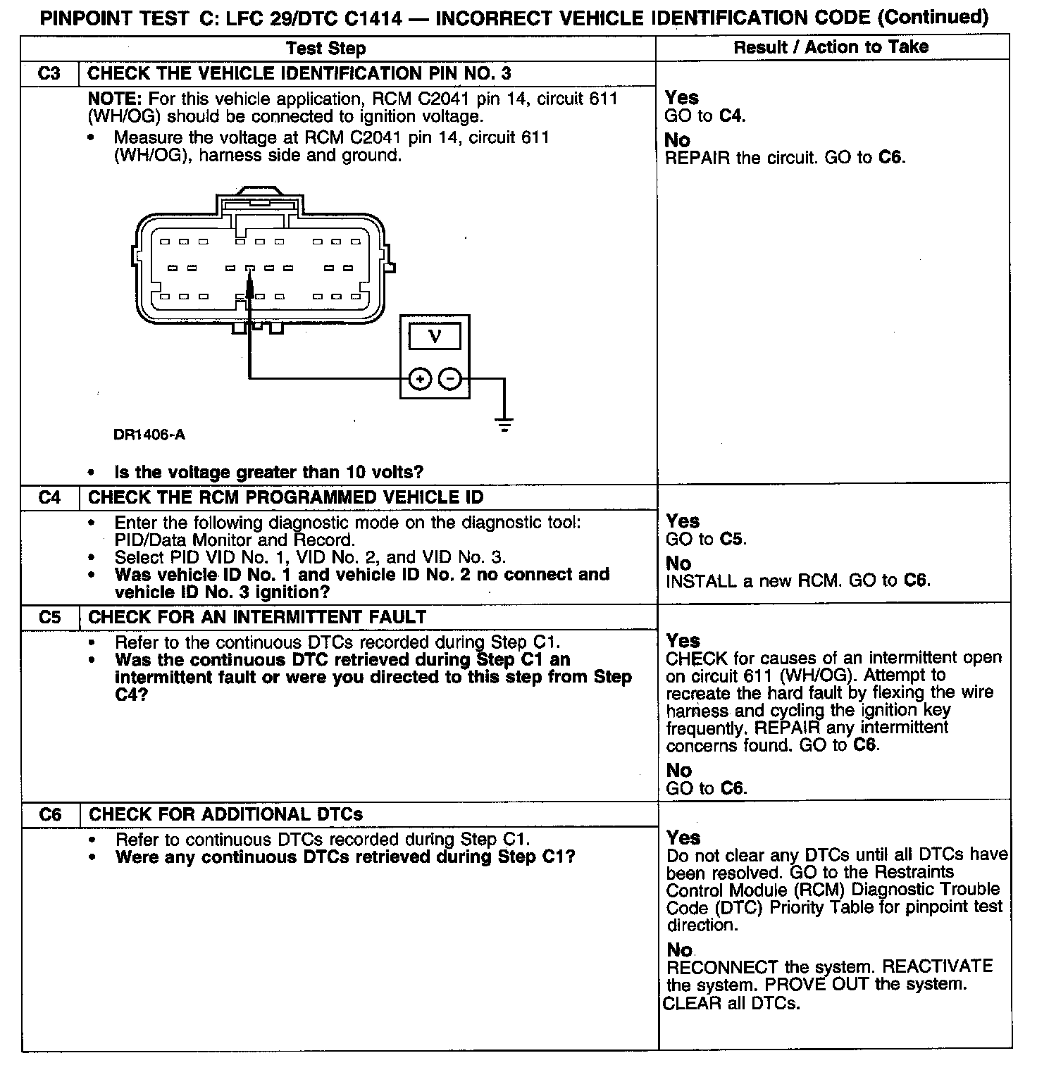 The restraints control module (RCM) monitors the electrical state of pins 10, 13 and 14 to determine if it is installed on the correct vehicle. If the RCM detects an incorrect condition on any of these pins, it will store a diagnostic trouble code (DTC) C1414 in memory and flash a lamp fault code (LFC) 29 (or higher priority code if one exists) on the air bag indicator.