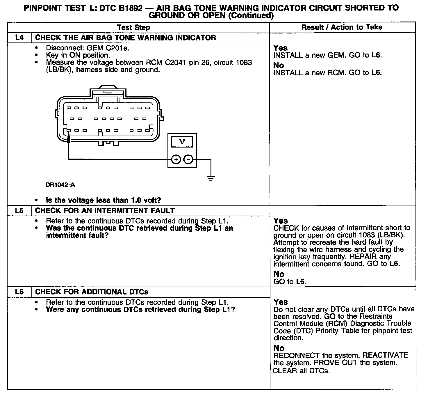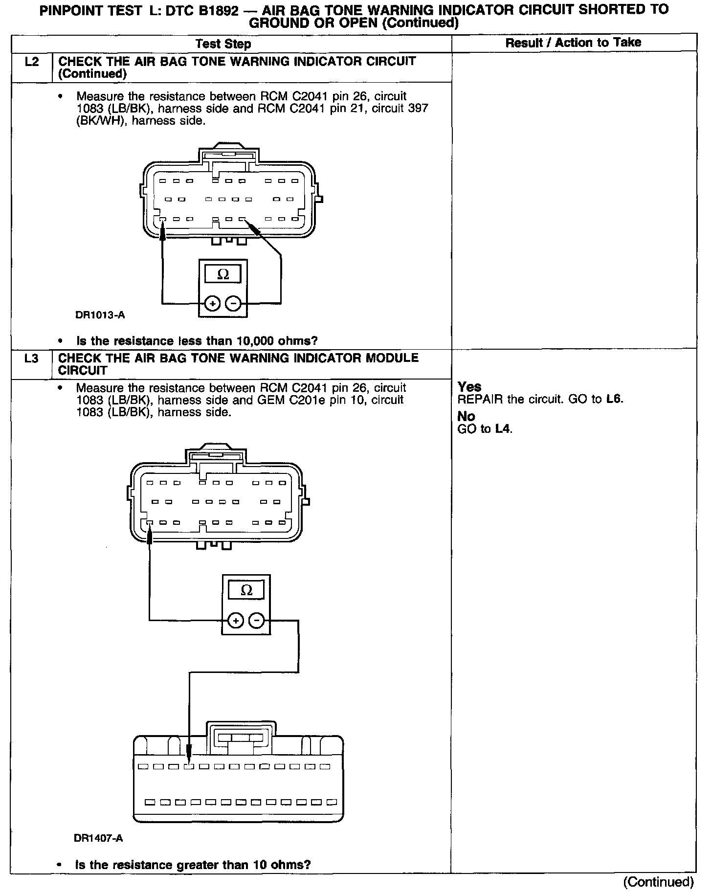 PINPOINT TEST L: B1892 - AIR BAG TONE WARNING INDICATOR CIRCUIT SHORTED TO GROUND OR OPENL1 - L2: