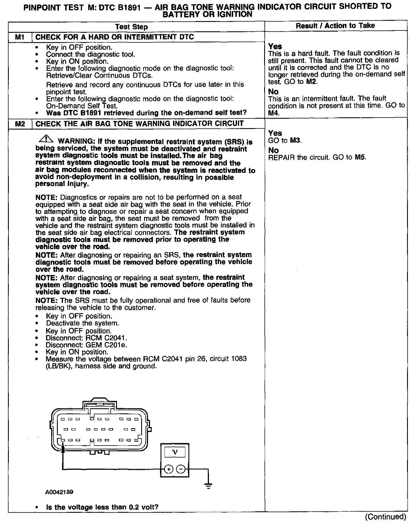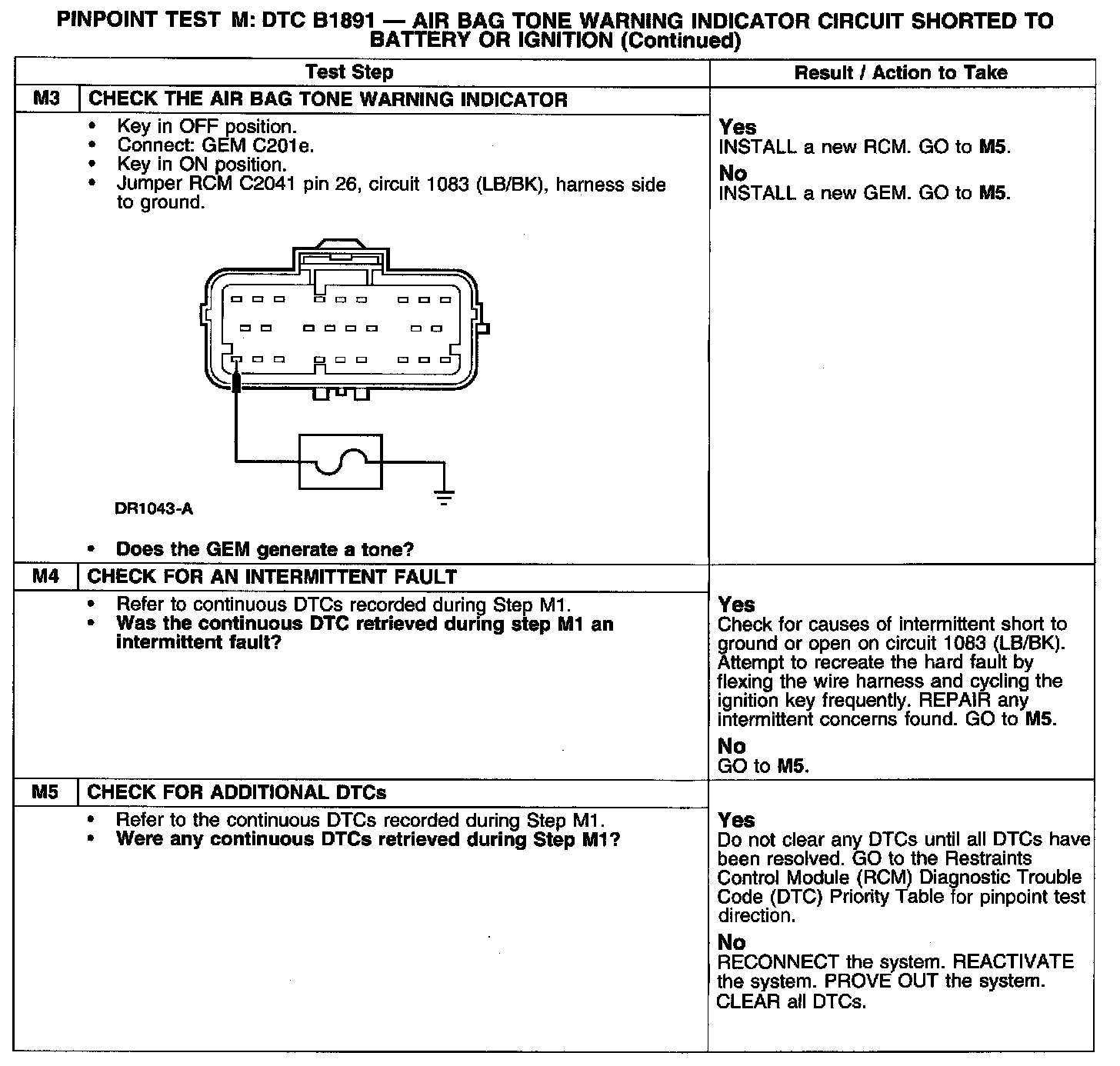 PINPOINT TEST M: DTC B1891 - AIR BAG TONE WARNING INDICATOR CIRCUIT SHORTED TO BATTERY OR IGNITIONM1 - M2:
