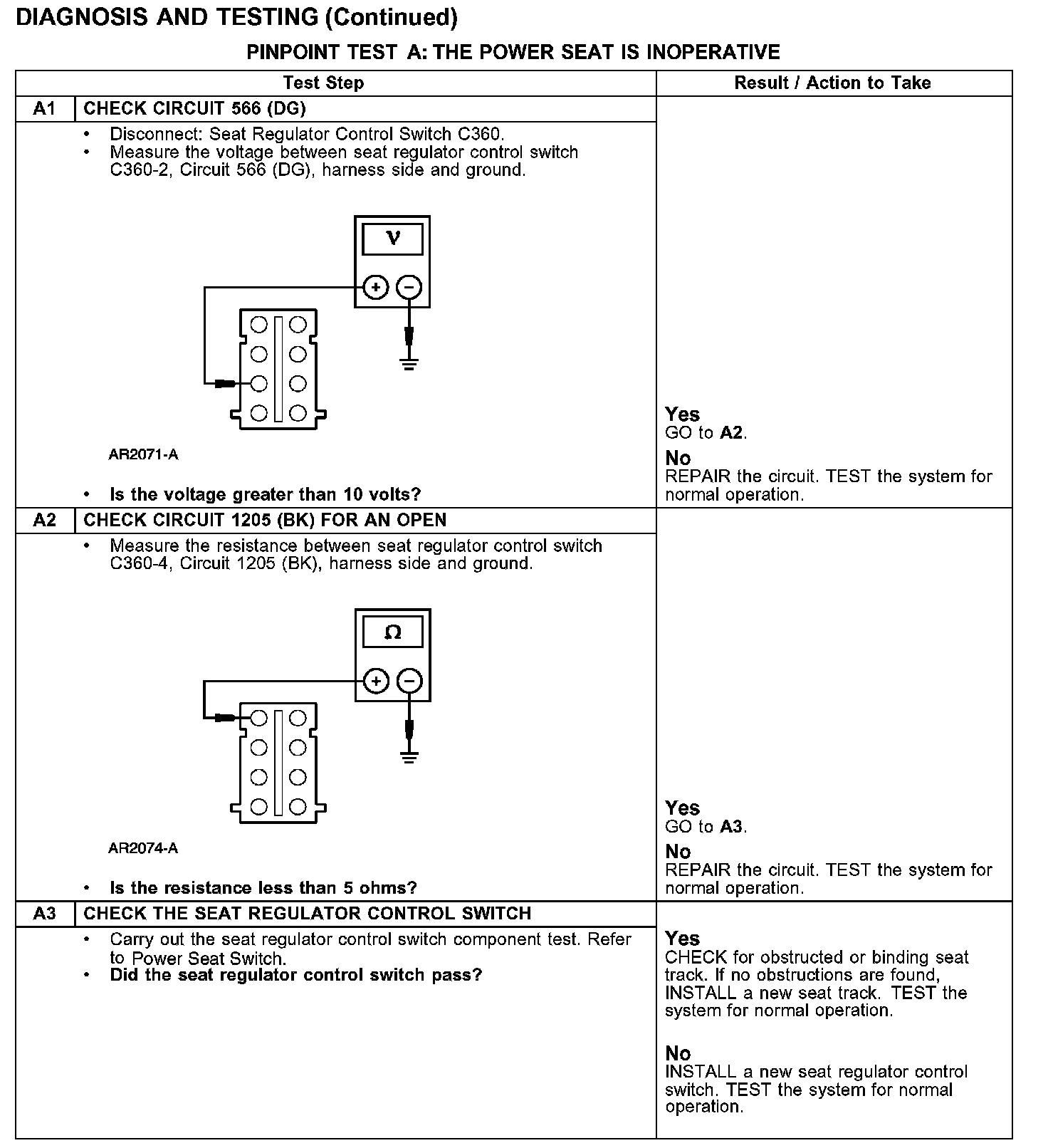 PINPOINT TEST A: THE POWER SEAT IS INOPERATIVE