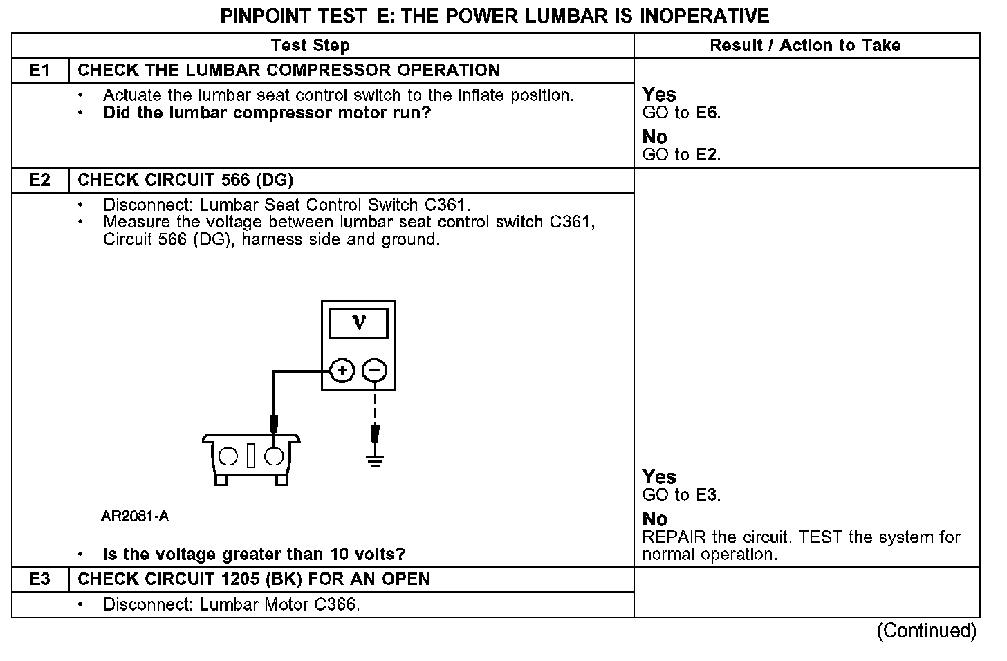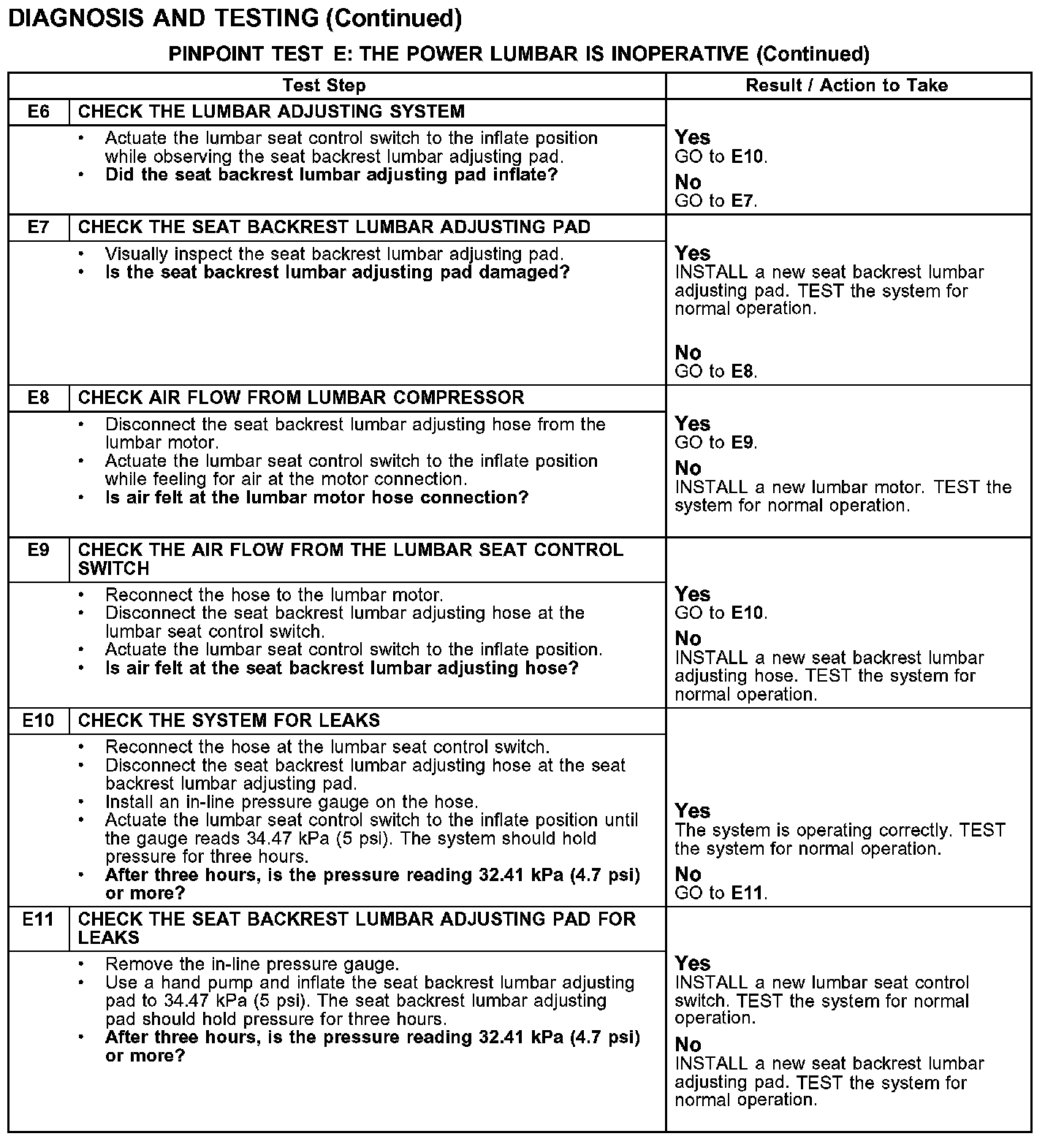 PINPOINT TEST E: THE POWER LUMBAR IS INOPERATIVE