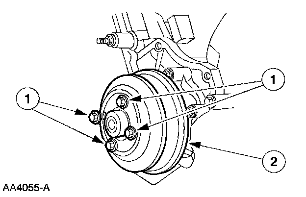 5. Remove bolts (1) and the water pump pulley (2).