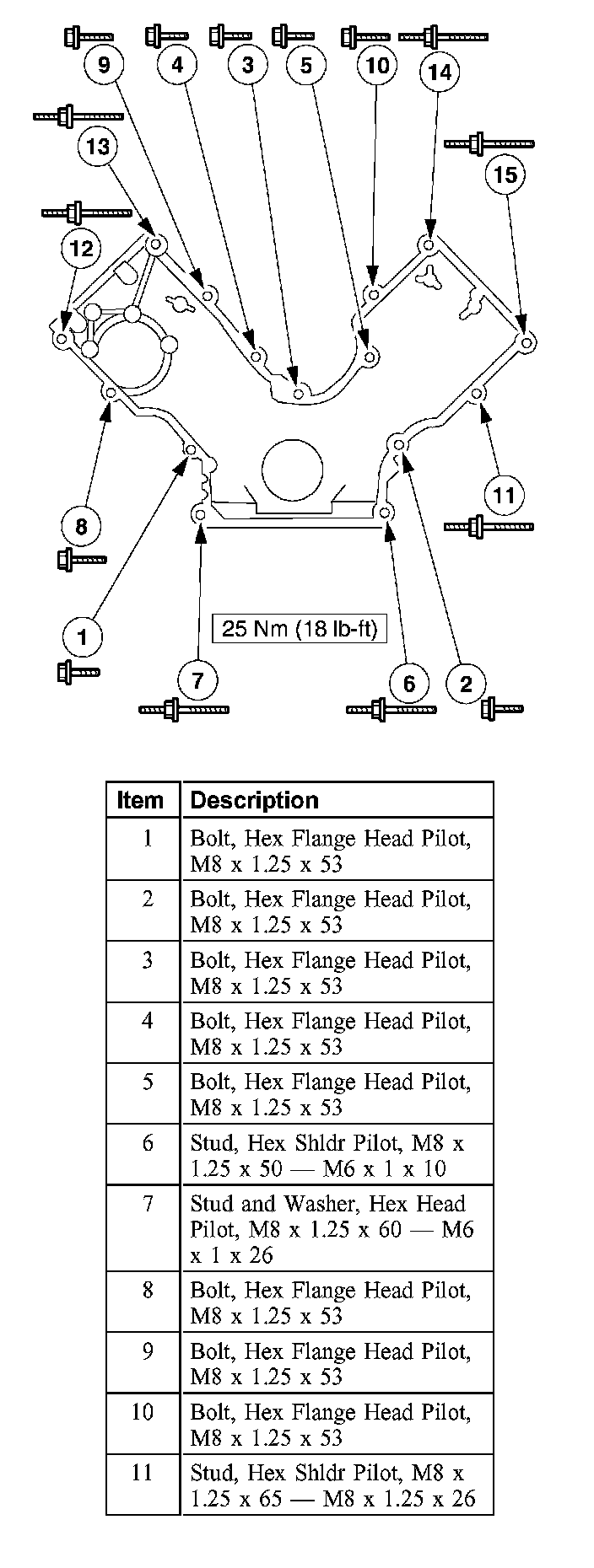 18. Remove the engine front cover bolts and the studs.