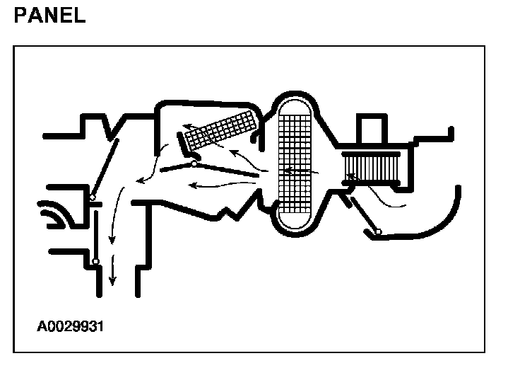 - The panel/defrost door vacuum control motor is full vacuum and the panel/floor door vacuum control motor is at no vacuum, directing airflow to the instrument panel A/C registers. A small amount of airflow from the side window demisters will be present.