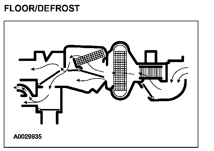 - The panel/floor door vacuum control motor is at full vacuum and the panel/defrost door vacuum control motor is at no vacuum, directing airflow to the floor duct. A small amount of airflow from the side window demisters will be present.
