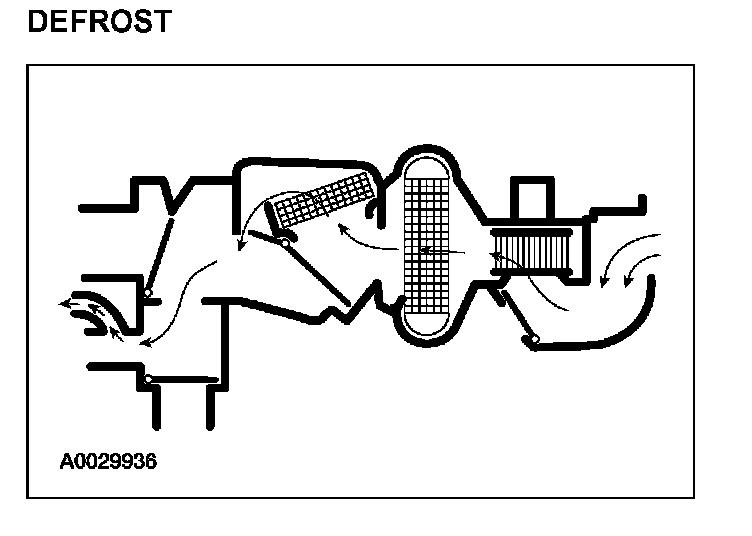 - The panel/floor door and panel/defrost door vacuum control motors are at no vacuum, directing airflow to the defroster duct and the side window demisters.