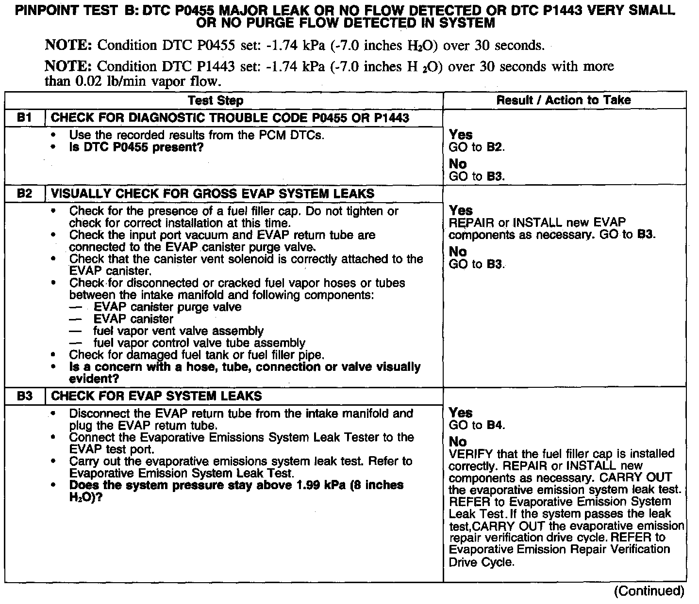 PINPOINT TEST B: DTC PO455 MAJOR LEAK OR NO FLOW DETECTED OR DTC P1443 VERY SMALL OR NO PURGE FLOW DETECTED IN SYSTEM
