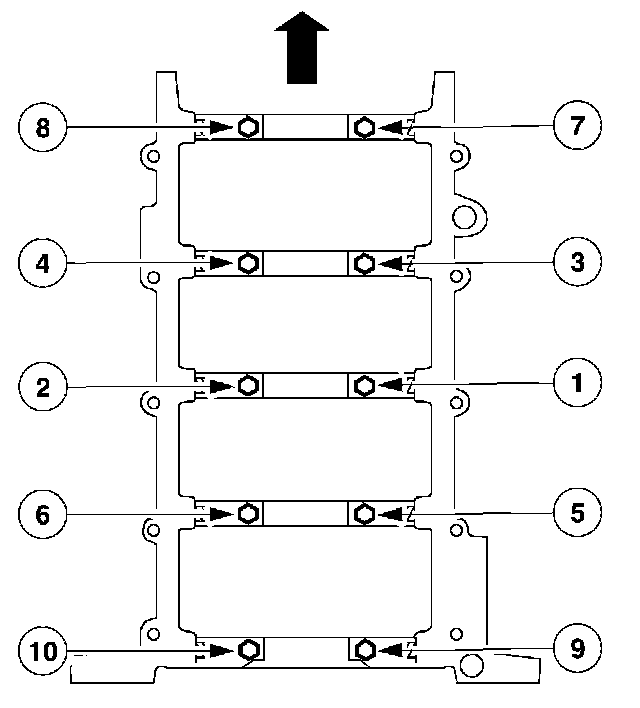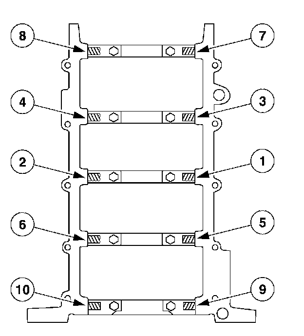 Install the vertical main bearing cap fasteners and tighten in the sequence shown.
