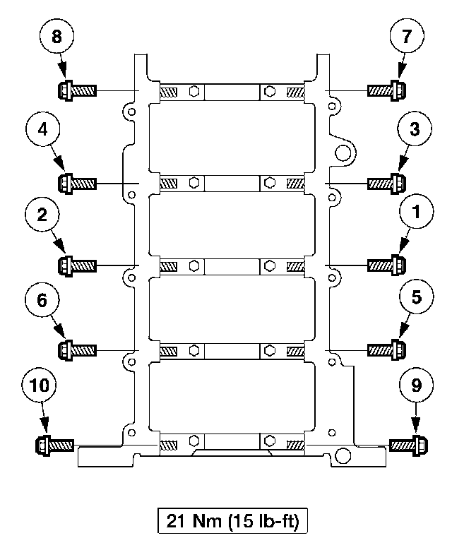 Install the side bolts 21 Nm (15 ft.lbs.)
