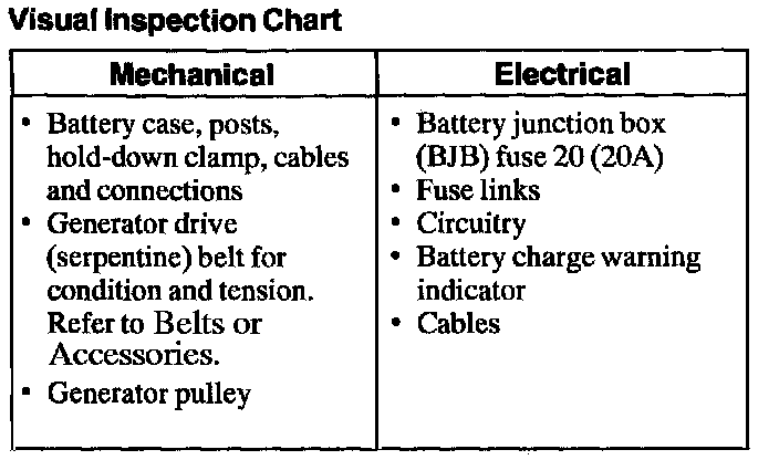 2. Inspect the charging system (battery, generator cable, harness connectors, connections) to determine if any obvious mechanical or electrical concerns exist. If found, repair as necessary and test the system for normal operation. Refer to the table.