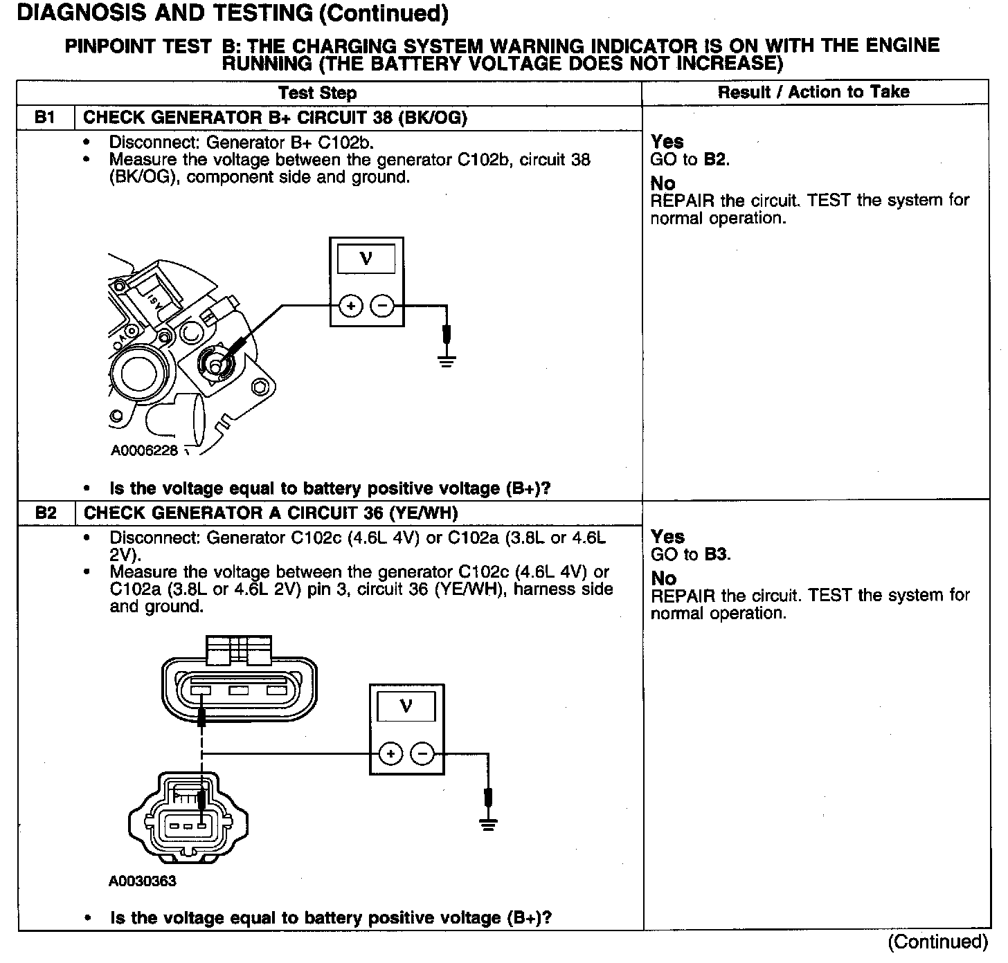 WARNING INDICATOR IS ON WITH THE ENGINE RUNNING (THE BATTERY VOLTAGE DOES NOT INCREASE)