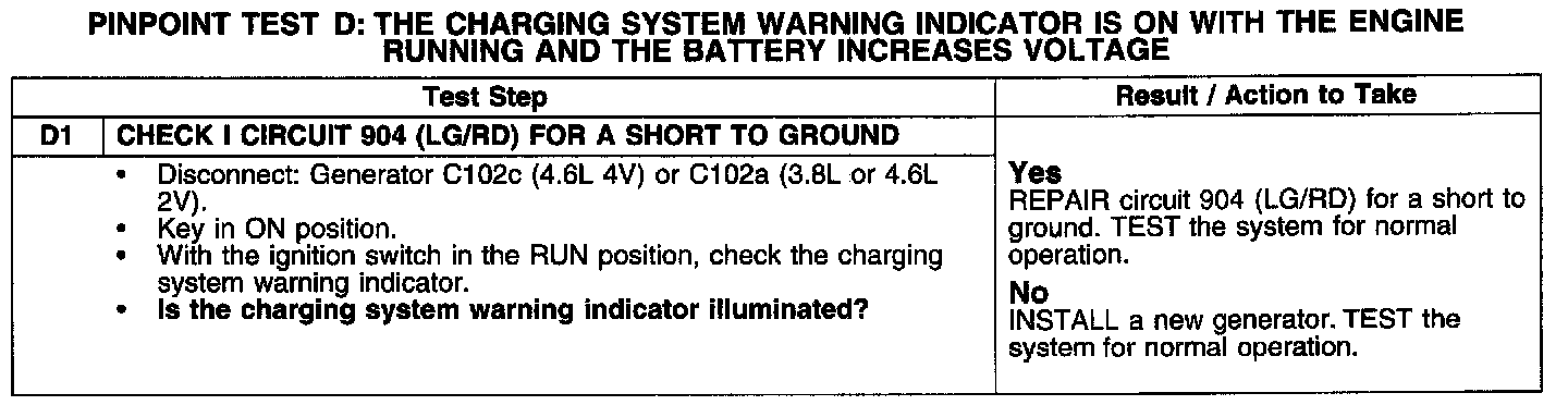 PINPOINT TEST D: THE CHARGING SYSTEM WARNING INDICATOR IS ON WITH THE ENGINE RUNNING AND THE BATTERY INCREASES VOLTAGE