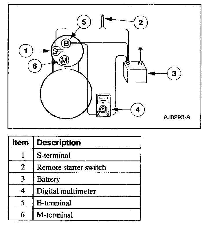 8. Remove the cables from solenoid B-, S- and M-terminals. Clean the cables and connections and reinstall the cables to the correct terminals. Repeat Steps 3 through 6. If the voltage drop reading is still greater than 0.5 volts when checked at the M-terminal and less than 0.5 volts when checked at the B-terminal, the concern is in the solenoid contacts. Install a new starter motor.