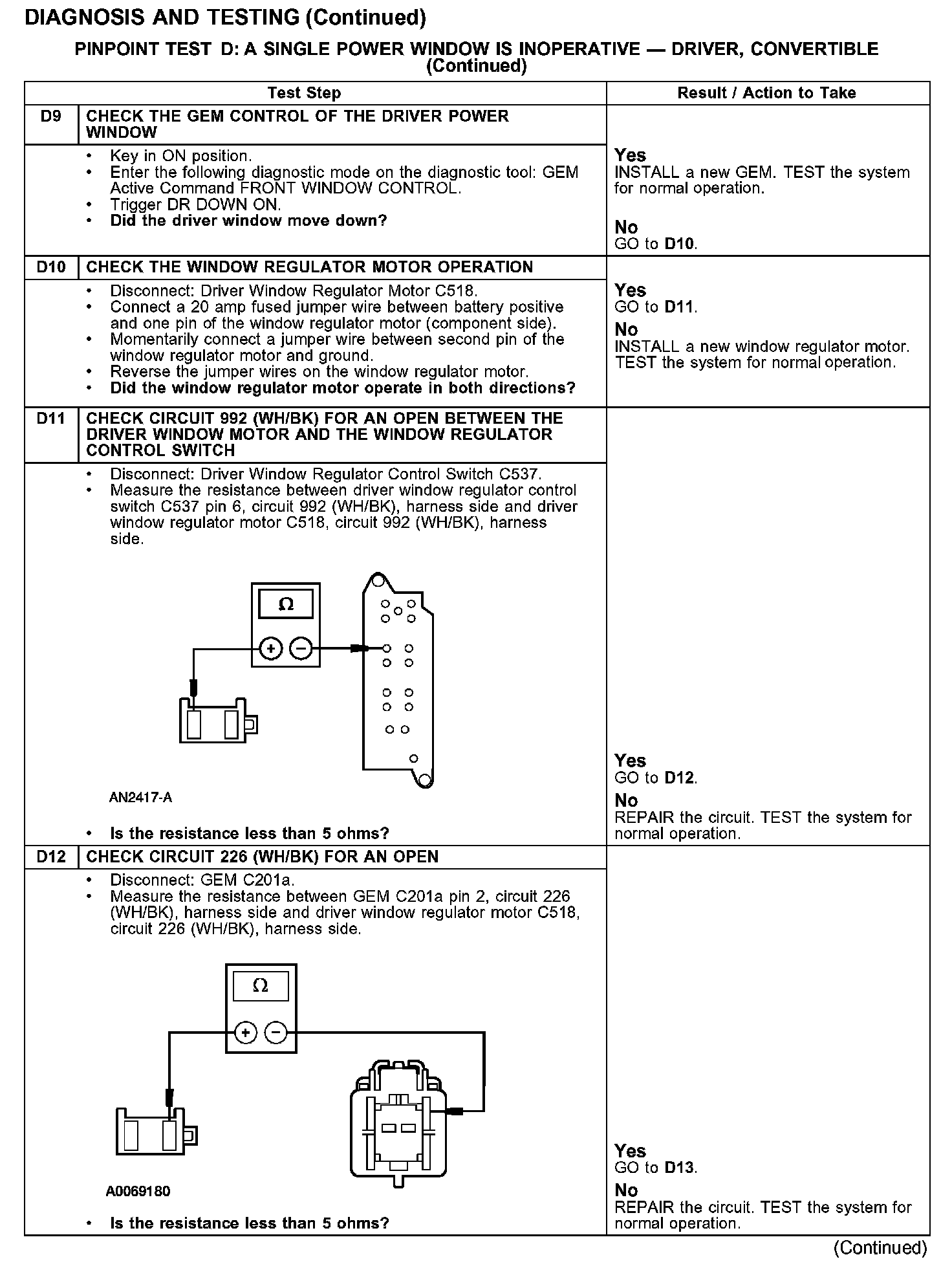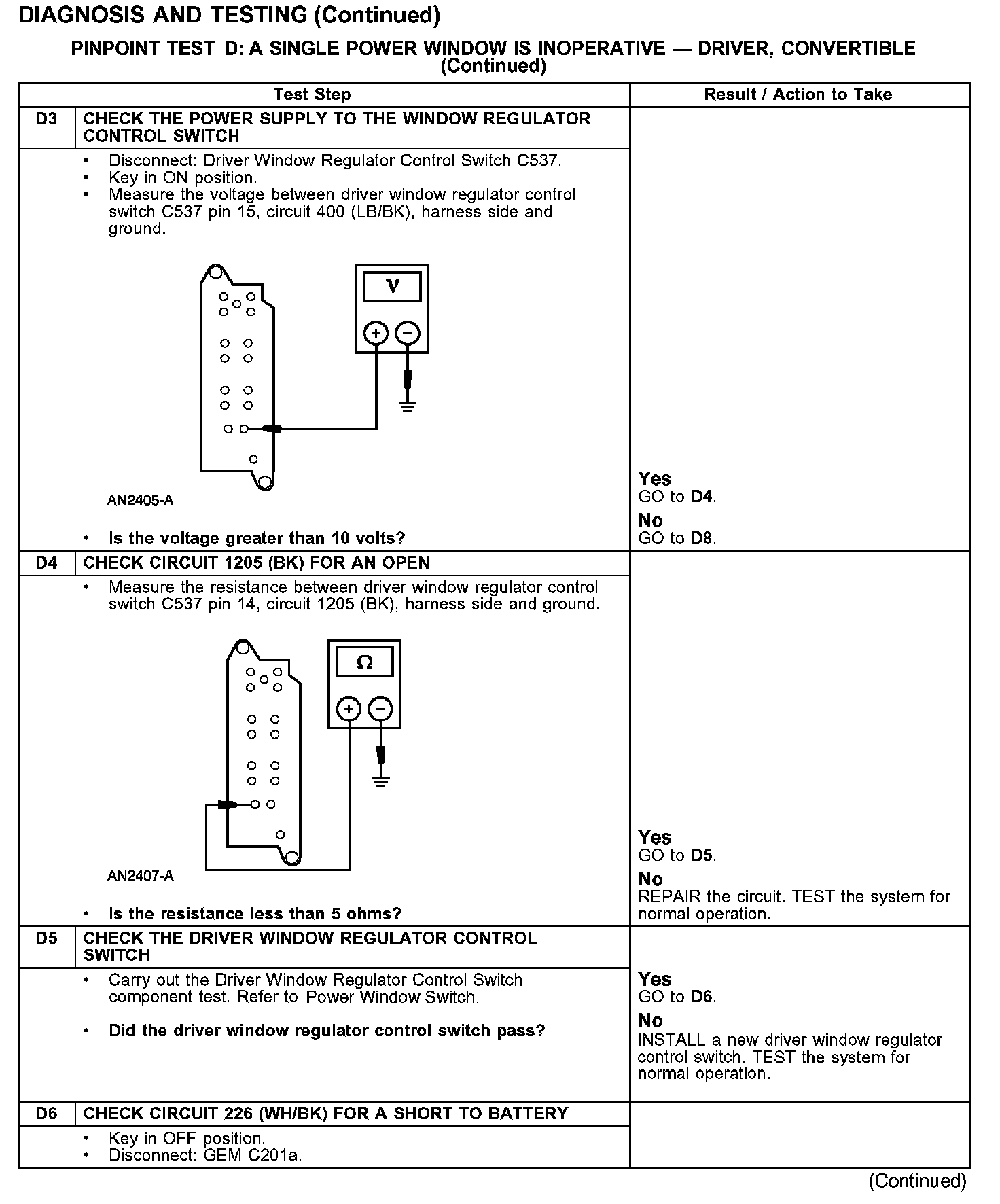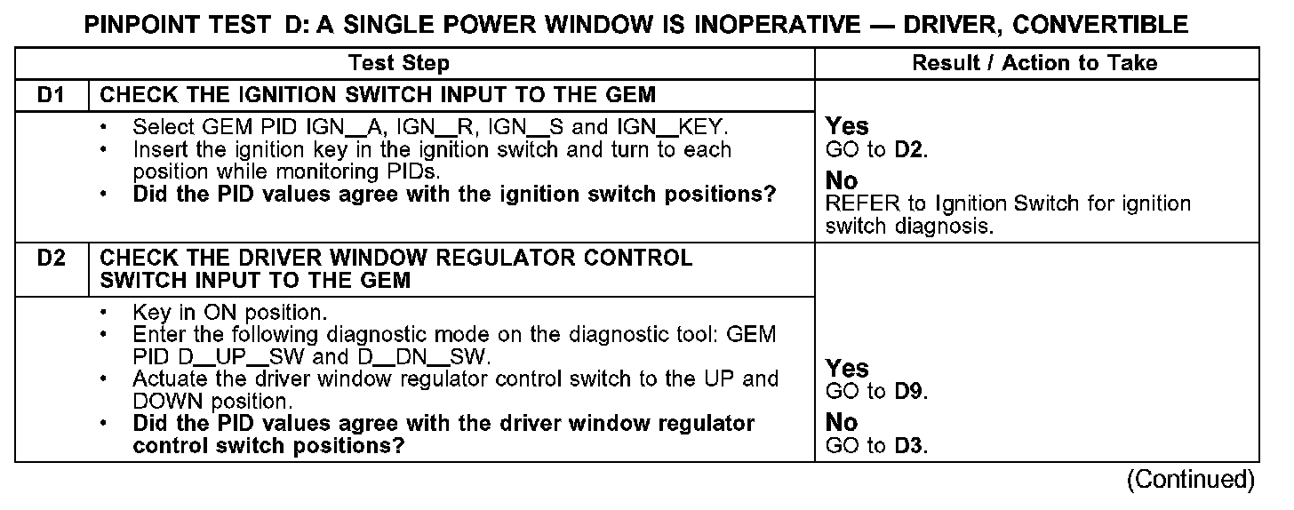 PINPOINT TEST D: A SINGLE POWER WINDOW IS INOPERATIVE - DRIVER, CONVERTIBLE