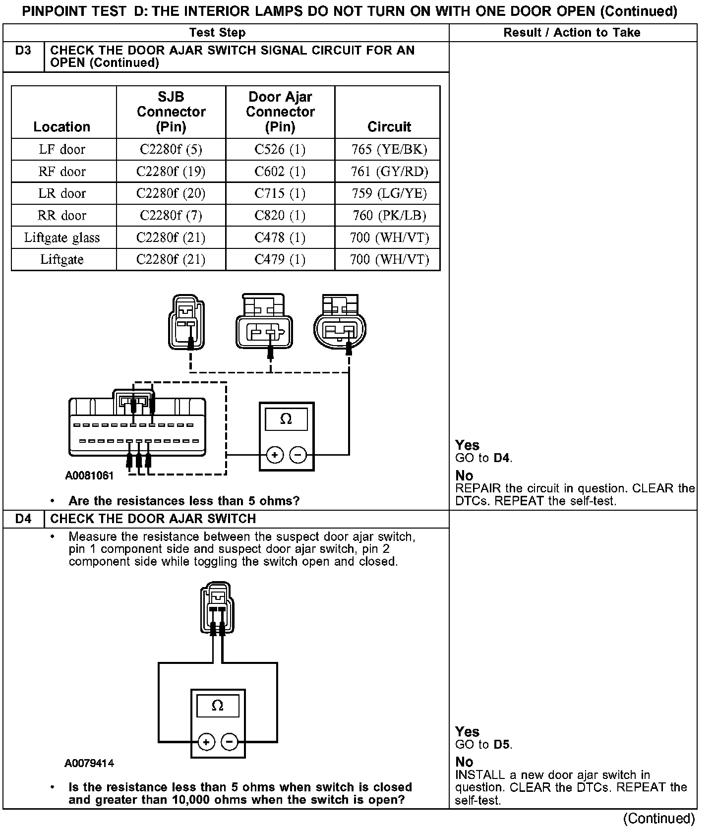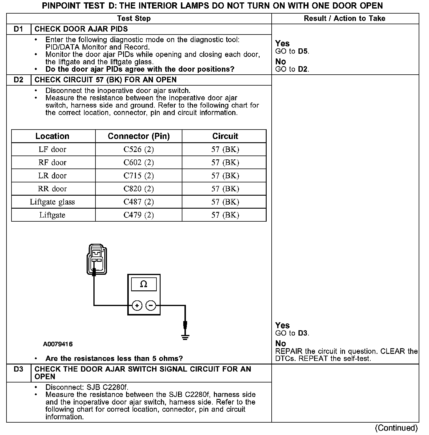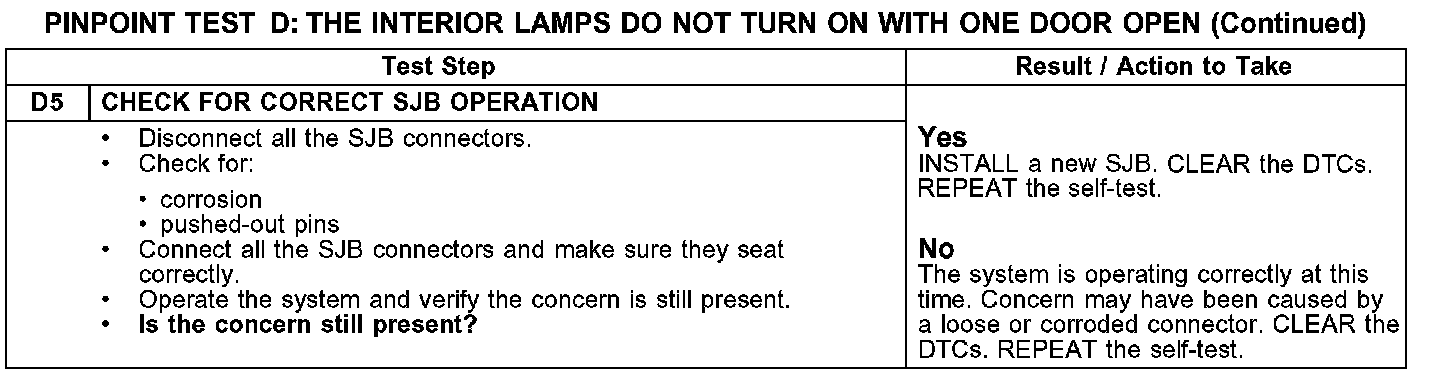 PINPOINT TEST D: THE INTERIOR LAMPS DO NOT TURN ON WITH ONE DOOR OPEN